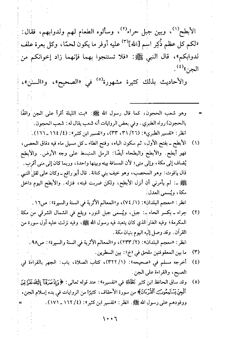 الأبطح1، وبين جبل حراء2، وسألوه الطعام لهم ولدوابهم، فقال: "لكم كلّ عظم ذُكِر اسم [الله] 3 عليه أوفر ما يكون لحماً، وكلّ بعرة علف لدوابكم"، قال النبي صلى الله عليه وسلم:"فلا تستنجوا بهما فإنهما زاد إخوانكم من الجن" 4.
