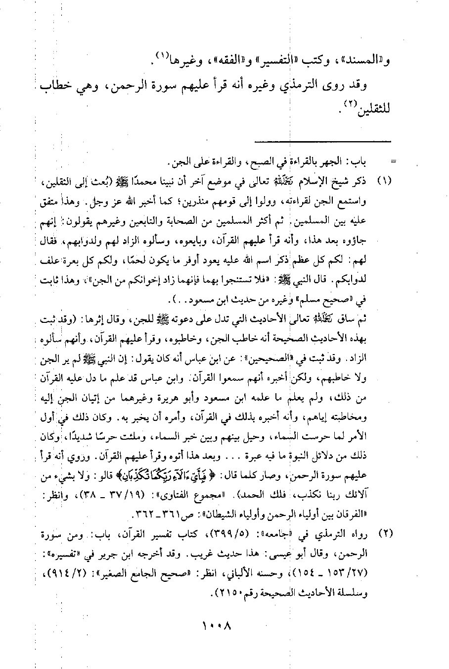 ثم ساق رحمه الله تعالى الأحاديث التي تدلّ على دعوته صلى الله عليه وسلم للجنّ، وقال إثرها: "وقد ثبت بهذه الأحاديث الصحيحة أنه خاطب الجن، وخاطبوه، وقرأ عليهم القرآن، وأنهم سألوه الزاد. وقد ثبت في الصحيحين عن ابن عباس أنه كان يقول: إن النبي صلى الله عليه وسلم لم ير الجن ولا خاطبهم، ولكن أخبره أنهم سمعوا القرآن. وابن عباس قد علم ما دلّ عليه القرآن من ذلك، ولم يعلم ما علمه ابن مسعود وأبو هريرة وغيرهما من إتيان الجنّ إليه ومخاطبته إياهم، وأنه أخبره بذلك في القرآن، وأمره أن يخبر به. وكان ذلك في أول الأمر لما حرست السماء، وحيل بينهم وبين خبر السماء، وملئت حرساً شديداً، وكان ذلك من دلائل النبوة ما فيه عبرة ... وبعد هذا أتوه وقرأ عليهم القرآن. وروي أنه قرأ عليهم سورة الرحمن، وصار كلما قال: {فَبِأَيِّ آلاءِ رَبِّكُمَا تُكَذِّبَانِ} قالوا: ولا بشيء من آلائك ربنا نكذب، فلك الحمد". مجموع الفتاوى 1937-38. وانظر الفرقان بين أولياء الرحمن وأولياء الشيطان ص 361-362.