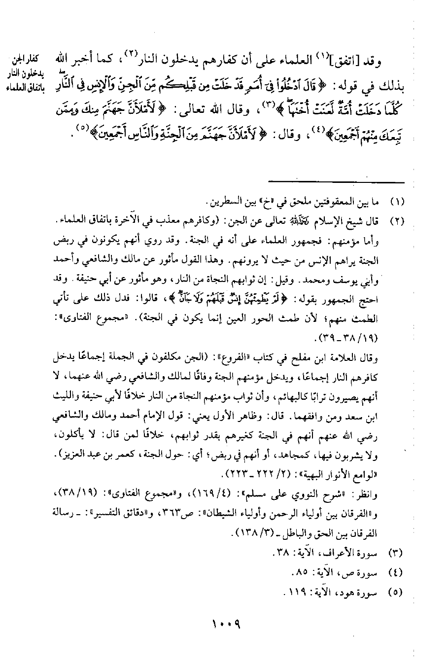 وقد [اتفق] 1 العلماء على أنّ كفارهم يدخلون النار2، كما أخبر الله بذلك في قوله: {قَالَ ادْخُلُوا في أممٍ قَدْ خَلَتْ من قَبلِكُمْ مِنَ الجِنِّ وَالإِنْسِ في النَّارِ كُلَّما دَخَلَتْ أُمَّةٌ لَعَنَتْ أُخْتَهَا} 3، وقال الله تعالى: {لأمْلأَنَّ جَهَنَّمَ مِنكَ وَمِمَّنْ تَبِعَكَ مِنْهُم أَجْمَعِينَ} 4، وقال: {لأَمْلأَنَّ جَهَنَّمَ مِنَ الجِنَّةِ وَالنَّاسِ أَجْمَعِين} 5.