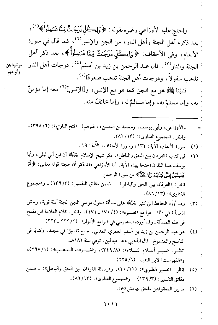 3 وقد أورد الحافظ ابن كثير رحمه الله على مسألة دخول مؤمني الجن الجنة أدلة قوية، وحقق المسألة في ذلك. فراجع تفسيره 4170-171. وانظر كلام العلامة ابن مفلح في هذه المسألة - وقد أورده السفاريني في لوامع الأنوار 2222-223.