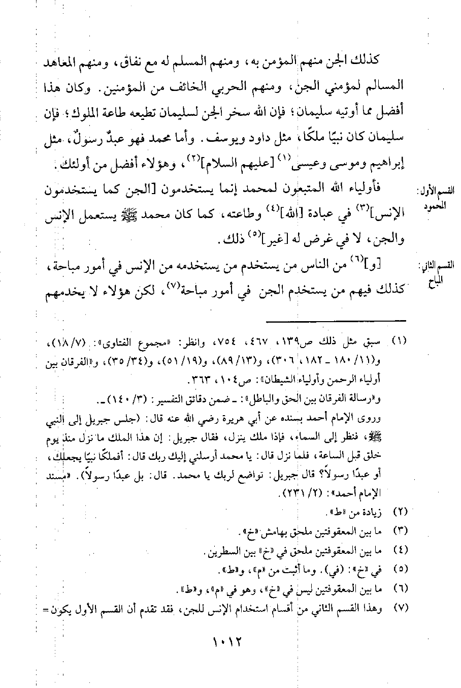فأولياء الله المتبعون لمحمد إنّما يستخدمون [الجن كما يستخدمون الإنس] 3 في عبادة [الله] 4 وطاعته، كما كان محمد صلى الله عليه وسلم يستعمل الإنس والجن، لا في غرض له [غير] 5 ذلك.