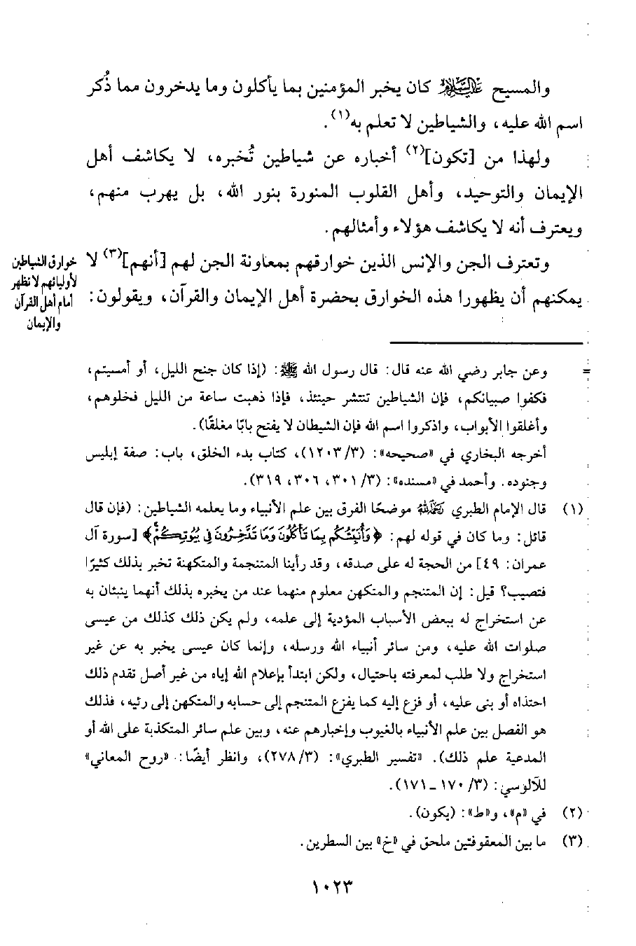 1 قال الإمام الطبري رحمه الله موضحاً الفرق بين علم الأنبياء وما يعلمه الشياطين: "فإن قال قائل: وما كان في قوله لهم: {وَأُنَبِّئُكُمْ بِمَا تَأْكُلُونَ وَمَا تَدَّخِرُونَ فِي بُيُوتِكُمْ} [سورة آل عمران، 49] من الحجة له على صدقه، وقد رأينا المتنجمة والمتكهنة تخبر بذلك كثيراً فتصيب؟ قيل: إن المتنجم والمتكهن معلوم منهما عند من يخبره بذلك أنهما ينبئان به عن استخراج له ببعض الأسباب المؤدية إلى علمه، ولم يكن ذلك كذلك من عيسى صلوات الله عليه، ومن سائر أنبياء الله ورسله، وإنما كان عيسى يخبر به عن غير استخراج ولا طلب لمعرفته باحتيال، ولكن ابتدأ بإعلام الله إياه من غير أصل تقدم ذلك احتذاه أو بنى عليه، أو فزع إليه كما يفزع المتنجم إلى حسابه والمتكهن إلى رئيه، فذلك هو الفصل بين علم الأنبياء بالغيوب وإخبارهم عنه، وبين علم سائر المتكذبة على الله أو المدعية علم ذلك". تفسير الطبري 3278. وانظر أيضاً روح المعاني للآلوسي 3170-171.