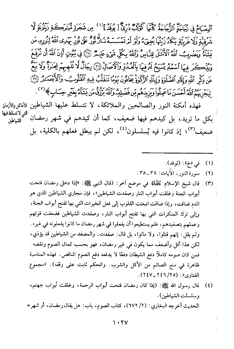 المِصْبَاحُ في زُجَاجَةٍ الزُّجَاجَةُ كَأَنَّهَا كَوْكَبٌ دُرِّيّ [يُوقَدُ] 1 مِنْ شَجَرَةٍ مُبَارَكَةٍ زَيْتُونَةٍ لا شَرْقِيَّةٍ وَلا غَرْبِيَّةٍ يَكَادُ زَيْتُهَا يُضِيءُ وَلَوْ لَمْ تَمْسَسْهُ نَارٌ نُورٌ عَلَى نُور يَهدِي اللهُ لِنُورِهِ مَنْ يَشَاء وَيَضْرِبُ اللهُ الأمْثَالَ للنَّاسِ وَاللهُ بِكُلِّ شَيْءٍ عَلِيم في بُيُوتٍ أَذِنَ اللهُ أَنْ تُرفَعَ وَيُذكَرَ فِيهَا اسْمُهُ يُسَبِّحُ لَهُ فِيهَا بِالغُدُوّ وَالآصالِ رِجَالٌ لا تُلْهِيهِمْ تِجَارَةٌ وَلا بَيْعٌ عَن ذِكرِ اللهِ وَإِقَامِ الصَّلاةِ وَإِيتَاءِ الزَّكَاةِ يَخَافُونَ يَومَاً تَتَقَلَّبُ فِيهِ القُلُوبُ وَالأبْصَارُ لِيَجْزِيَهُمُ اللهُ أَحْسَن مَا عَمِلُوا وَيَزِيدهُمْ مِن فَضْلِهِ وَاللهُ يَرْزُقُ مَنْ يَشَاءُ بِغَيرِ حِسَاب} 2