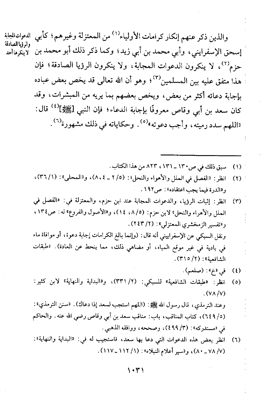 والذين ذكر عنهم إنكار كرامات الأولياء1 من المعتزلة وغيرهم؛ كأبي إسحاق الاسفرايني، وأبي محمد بن أبي زيد؛ وكما ذكر ذلك أبو محمد بن حزم2، لا ينكرون الدعوات المجابة، ولا ينكرون الرؤيا الصادقة؛ فإن هذا متفق عليه بين المسلمين3؛ وهو أن الله تعالى قد يخصّ بعض عباده بإجابة دعائه أكثر من بعض، ويخصّ بعضهم بما يريه من المبشّرات. وقد كان سعد بن أبي وقاص معروفاً بإجابة الدعاء؛ فإنّ النبيّ [صلى الله عليه وسلم] 4 قال: "اللهمّ سدّد رميته، وأجب دعوته"5. وحكاياته في ذلك مشهورة6.