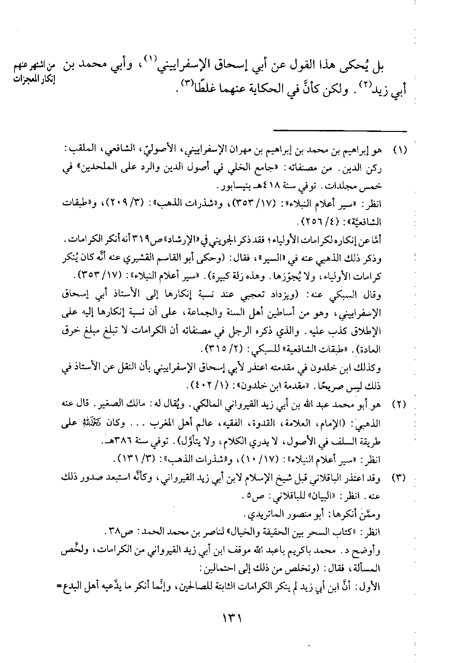 وعلى كلا الاحتمالين، فلا يعتبر منكراً لكرامات الأولياء؛ لأنّه إما لم يكن وقع منه أصلاً، أو يكون قد وقع منه، ورجع عنه. والله أعلم) .