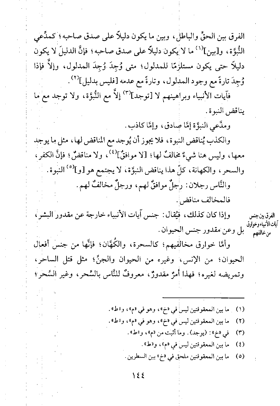 الفرق بين الحقّ والباطل، وبين ما يكون دليلاً على صدق صاحبه؛ كمدّعي النبوّة، و [بين] 1 ما لا يكون دليلاً على صدق صاحبه؛ فإنّ الدليلَ لا يكون دليلاً حتى يكون مستلزماً للمدلول؛ متى وُجِدَ وُجِدَ المدلول، وإلاّ فإذا وُجِدَ تارةً مع وجود المدلول، وتارةً مع عدمه [فليس بدليل] 2.