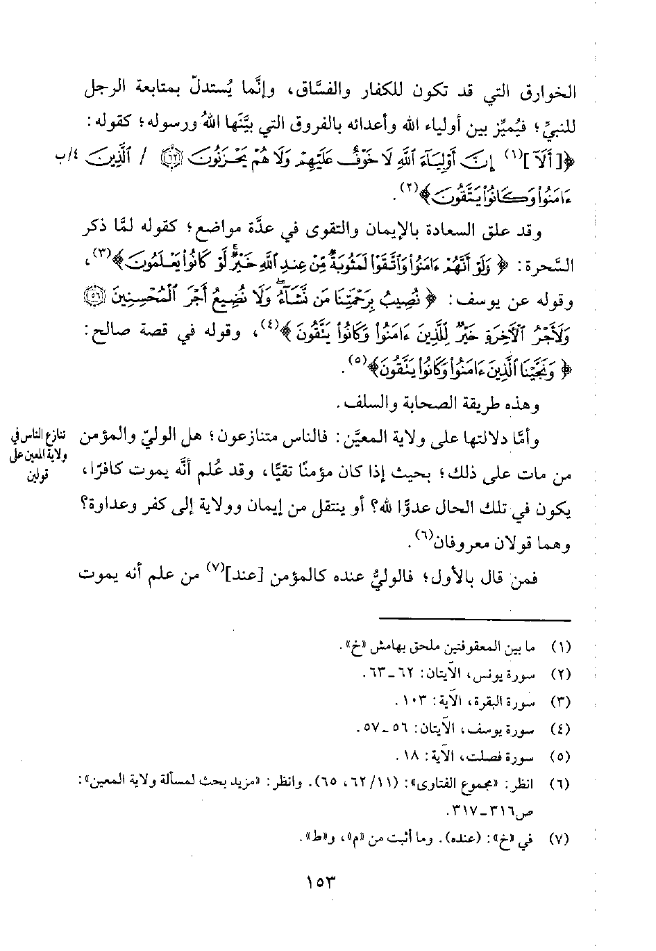 وأمّا دلالتها على ولاية المعيّن: فالناس متنازعون؛ هل الوليّ والمؤمن من مات على ذلك؛ بحيث إذا كان مؤمناً تقيّاً، وقد عُلم أنّه يموت كافراً، يكون في تلك الحال عدوّاً لله؟ أو ينتقل من إيمان وولاية إلى كفر وعداوة؟. وهما قولان معروفان6.