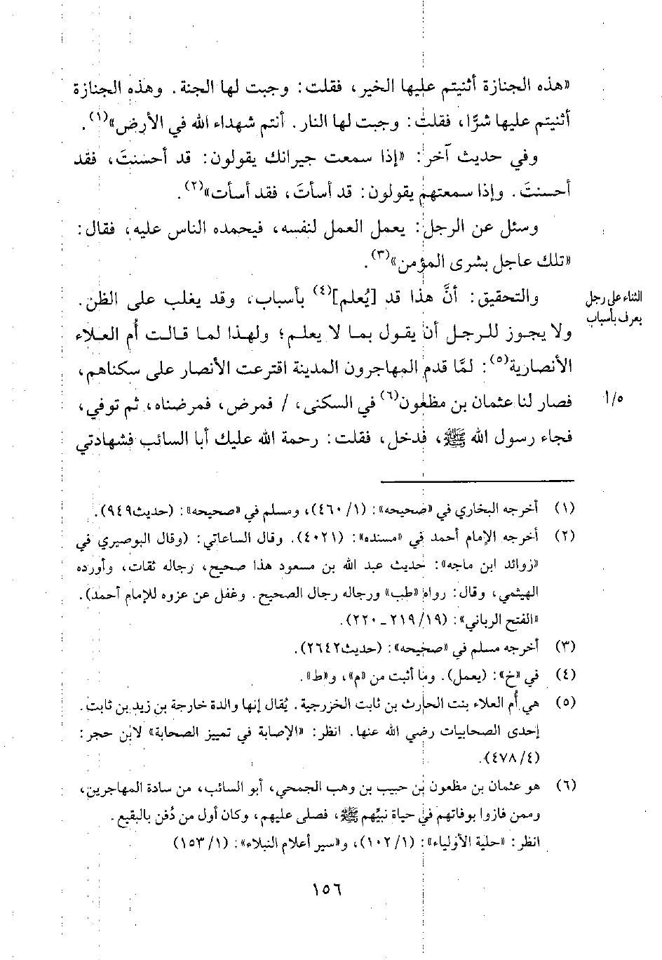 والتحقيق: أنّ هذا قد [يُعلم] 4 بأسباب، وقد يغلب على الظن. ولا يجوز للرجل أن يقول بما لا يعلم؛ ولهذا لما قالت أم العلاء الأنصارية5: لمّا قدم المهاجرون المدينة اقترعت الأنصار على سكناهم، فصار لنا عثمان بن مظعون6 في السكنى، / فمرض، فمرضناه، ثم توفي، فجاء رسول الله صلى الله عليه وسلم، فدخل، فقلت: رحمة الله عليك أبا السائب فشهادتي