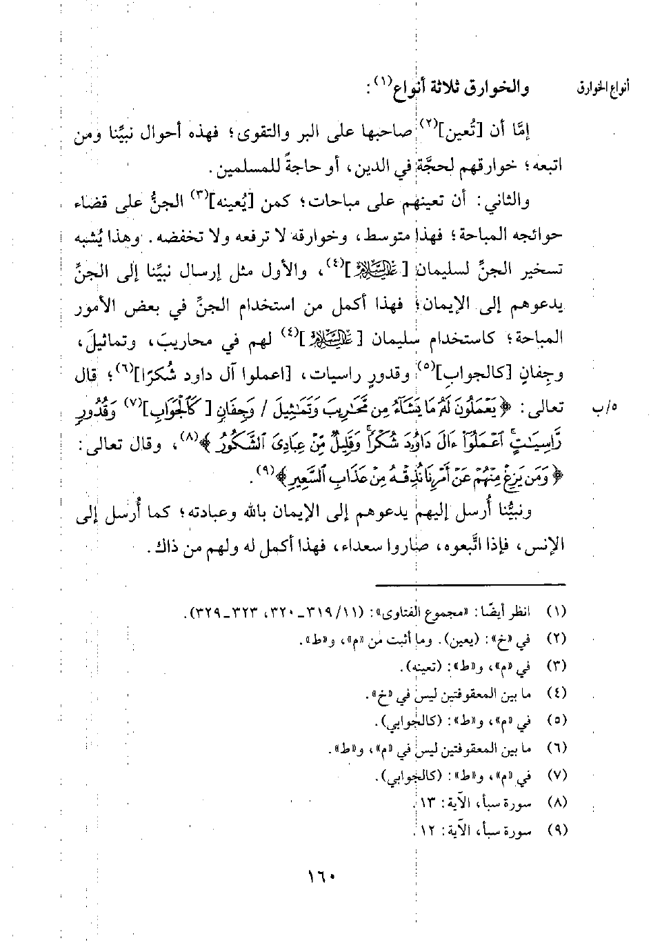 والثاني: أن تعينهم على مباحات؛ كمن [يُعينه] 3 الجنّ على قضاء حوائجه المباحة؛ فهذا متوسط، وخوارقه لا ترفعه ولا تخفضه. وهذا يُشبه تسخير الجنّ لسليمان [عليه السلام] 4. والأول مثل إرسال نبيّنا إلى الجنّ يدعوهم إلى الإيمان؛ فهذا أكمل من استخدام الجنّ في بعض الأمور المباحة؛ كاستخدام سليمان [عليه السلام] 5 لهم في محاريبَ، وتماثيلَ، وجِفانٍ [كالجوابِ] 6 وقدورٍ راسيات، [اعملوا آل داود شُكراً] 7؛ قال تعالى: {يَعْمَلُونَ لَهُ مَا يَشَاءُ مِنْ مَحَارِيبَ وَتَمَاثِيلَ وَجِفَانٍ [كَالجَوَابِ] 8 وَقُدُورٍ رَاسِيَاتٍ اعْملُوا آلَ دَاوُدَ شُكْرَاً وَقَلِيلٌ مِنْ عِبَادِيَ الشَّكُور} 9، وقال تعالى: {وَمَنْ يَزِغْ مِنْهُمْ عَنْ أَمْرِنَا نُذِقْهُ مِنْ عَذَابِ السَّعِير} 10.