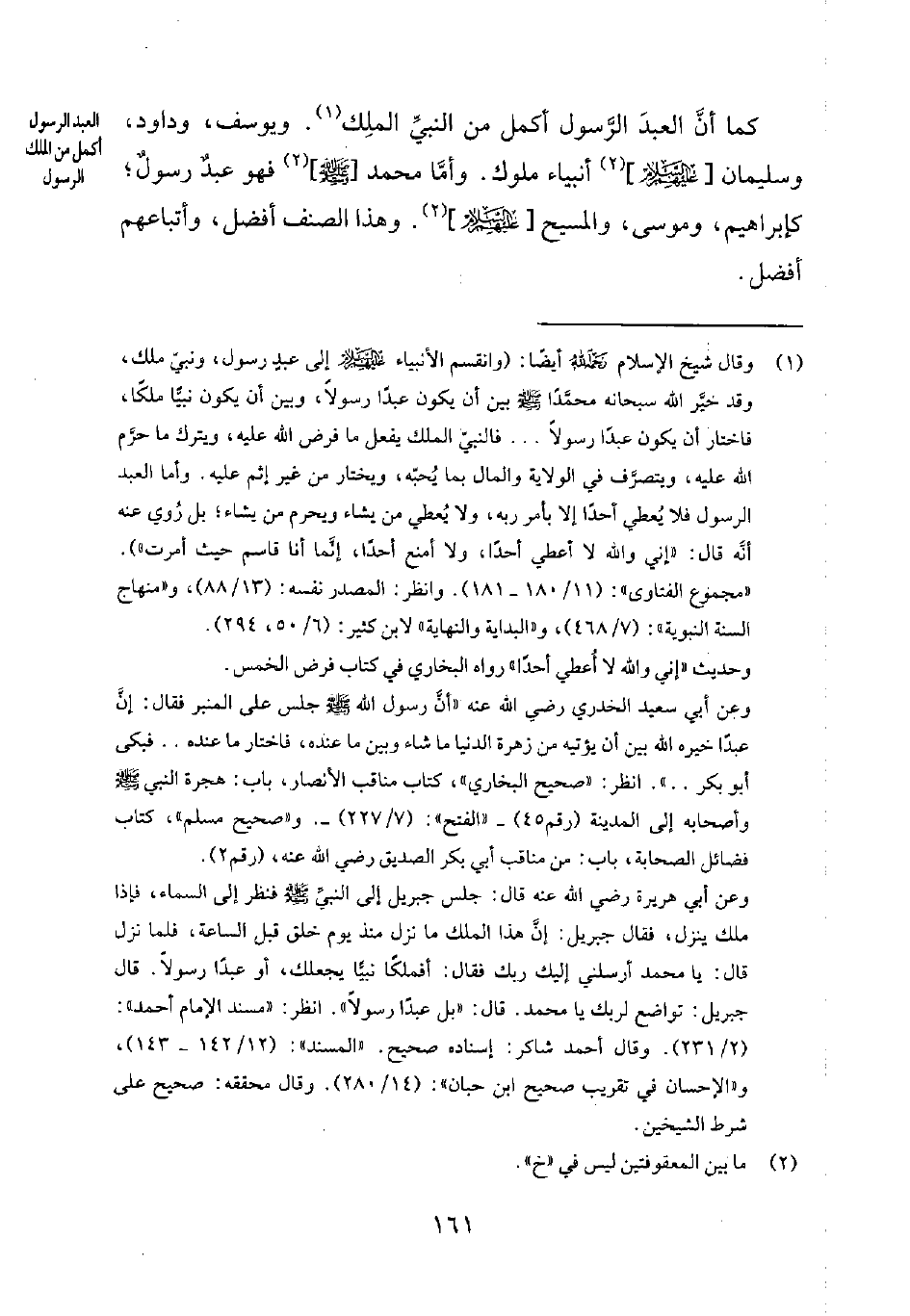 كما أنّ العبدَ الرّسول أكمل من النبيّ الملِك1. ويوسف، وداود، وسليمان [عليهم السلام] 2 أنبياء ملوك. وأمّا محمّد [صلى الله عليه وسلم] 3 فهو عبدٌ رسولٌ؛ كإبراهيم، وموسى، والمسيح [عليهم السلام] 4. وهذا الصنف أفضل، وأتباعهم أفضل.