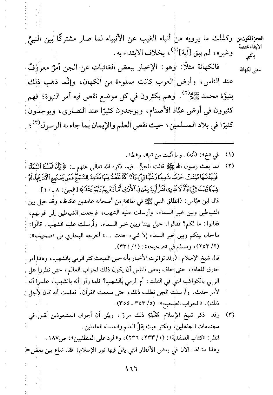 فالكهانة مثلاً: وهو الإخبار ببعض الغائبات عن الجن: أمرٌ معروفٌ عند الناس. وأرض العرب كانت مملوءة من الكهان، وإنّما ذهب ذلك بنبوّة محمد صلى الله عليه وسلم 2. وهم يكثرون في كل موضع نقص فيه أمر النبوة؛ فهم كثيرون في أرض عبّاد الأصنام، ويوجدون كثيراً عند النصارى، ويوجدون كثيراً في بلاد المسلمين؛ حيث نقص العلم والإيمان بما جاء به الرسول3؛
