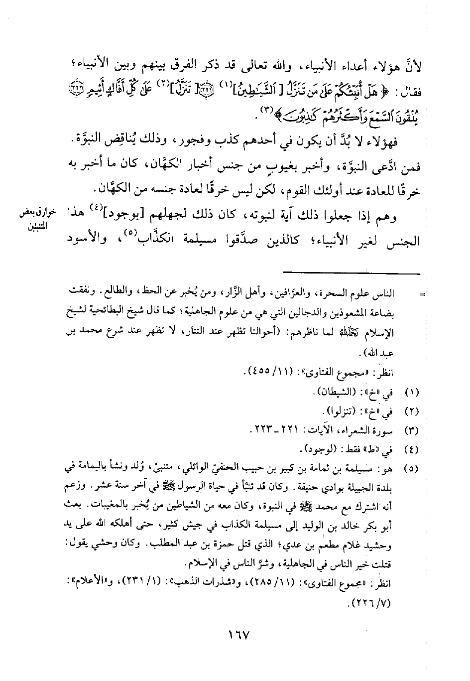 فهؤلاء لا بُدّ أن يكون في أحدهم كذب وفجور، وذلك يُناقِض النبوّة. فمن ادّعى النبوّة، وأخبر بغيوبٍ من جنس أخبار الكهّان، كان ما أخبر به خرقاً للعادة عند أولئك القوم، لكن ليس خرقاً لعادة جنسه من الكهّان.