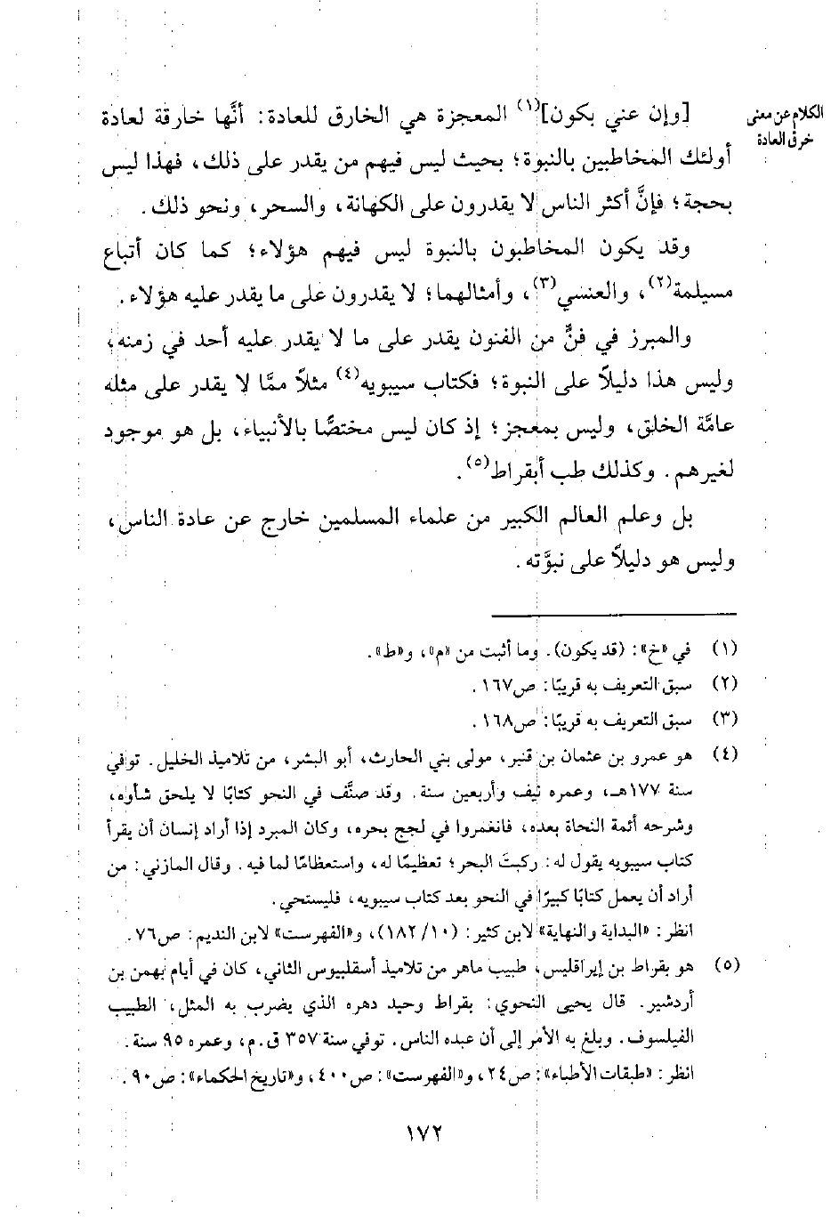 والمبّرز في فنٍ من الفنون يقدر على ما لا يقدر عليه أحد في زمنه، وليس هذا دليلاً على النبوة؛ فكتاب سيبويه4 مثلاً ممّا لا يقدر على مثله عامّة الخلق، وليس بمعجز؛ إذ كان ليس مختصاً بالأنبياء، بل هو موجود لغيرهم. وكذلك طب أبقراط5.