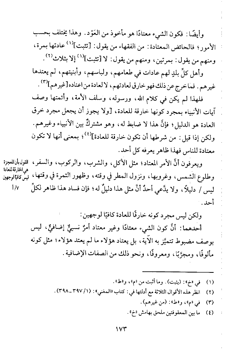 وأهل كلّ بلدٍ لهم عادات في طعامهم، ولباسهم، وأبنيتهم، لم يعتدها غيرهم. فما خرج عن ذلك فهو خارق لعادتهم، لا لعادة من اعتاده [غيرهم] 4.