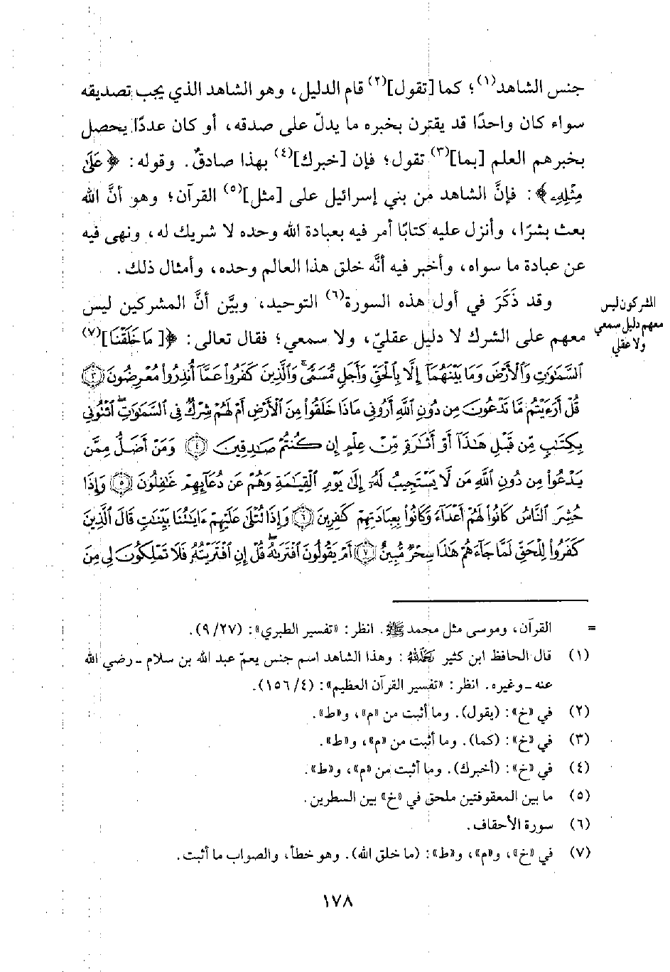وقد ذَكَرَ في أول هذه السورة6 التوحيد، وبيّن أنّ المشركين ليس معهم على الشرك لا دليل عقليّ، ولا سمعيّ؛ فقال تعالى: { [مَا خَلَقْنَا] 7 السَّمَوَاتِ وَالأَرْضَ وَمَا بَيْنَهُمَا إِلاَّ بِالحَقِّ وَأَجَلٍ مُسَمَّى وَالَّذِينَ كَفَرُوا عَمَّا أُنْذِرُوا مُعْرِضُونَ قُلْ أَرَأَيْتُمْ مَا تَدْعُونَ مِنْ دُونِ اللهِ أَرُونِي مَاذَا خَلَقُوا مِنَ الأَرْضِ أَمْ لَهُمْ شِرْكٌ في السَّمَوَاتِ ائْتُونِي بِكِتَابٍ مِنْ قَبْلِ هَذَا أَوْ أَثَارَةٍ مِنْ عِلْمٍ إِنْ كُنْتُمْ صَادِقِينَ وَمَنْ أَضَلّ مِمَّنْ يَدْعُو مِنْ دُوْنِ اللهِ مَنْ لا يَسْتَجِيبُ لَهُ إِلَى يَوْمِ القِيَامَةِ وَهُمْ عَنْ دُعَائِهِمْ غَافِلُونَ وَإِذَا حُشِرَ النَّاسُ كَانُوا لَهُمْ أَعْدَاءً وَكَانُوا بِعِبَادَتِهِمْ كَافِرِينَ وَإِذَا تُتْلَى عَلَيْهِمْ آيَاتُنَا بَيِّنَاتٍ قَالَ الَّذِينَ كَفَرُوا لِلْحَقِّ لَمَّا جَاءَهُمْ هَذَا سِحْرٌ مُبِينٌ أَمْ يَقُولُونَ افْتَرَاهُ قُلْ إِنِ افْتَرَيْتُهُ فَلا تَمْلِكُونَ لِي مِنَ