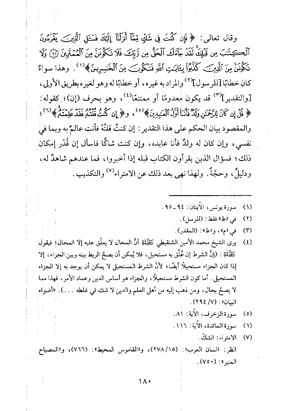 وقال تعالى: {فَإِنْ كُنْتَ في شَكّ مِمَّا أَنْزَلْنَا إِلَيْكَ فَاسْأَلِ الَّذِينَ يَقْرَؤُنَ الكِتَابَ مِنْ قَبْلِكَ لَقَدْ جَاءَكَ الحَقُّ مِنْ رَبِّك فلا تَكُونَنَّ مِنَ المُمْتَرِينَ وَلا تَكُونَنَّ مِنَ الّذِينَ كذَّبُوا بِآيَاتِ اللهِ فَتَكُونَ مِنَ الخَاسِرِينَ} 1. وهذا سواءٌ كان خطاباً [للرسول] 2 والمراد به غيره، أو خطاباً له وهو لغيره بطريق الأولى. [والتقدير] 3 قد يكون معدوماً أو ممتنعاً4، وهو بحرف (إن) ؛ كقوله: {قُلْ إِنْ كَانَ للرَّحْمَنِ وَلَدٌ فَأَنَا أَوَّلُ العَابِدِيْنَ} 5، و {إِنْ كُنْتُ قُلْتُهُ فَقَدْ عَلِمْتَهُ} 6؛ والمقصود بيان الحكم على هذا التقدير: إن كنتُ قلتُهُ فأنت عالمٌ به وبما في نفسي، وإن كان له ولدٌ فأنا عابده، وإن كنت شاكّاً فاسأل إن قُدّر إمكان ذلك؛ فسؤال الذين يقرءون الكتاب قبله إذا أخبروا، فما عندهم شاهدٌ له، ودليلٌ، وحجّةٌ. ولهذا نهى بعد ذلك عن الامتراء7 والتكذيب.