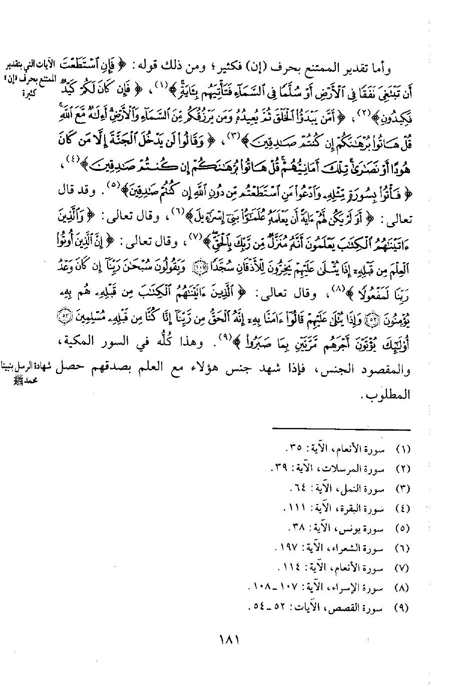 وأما تقدير الممتنع بحرف (إن) فكثيرٌ، ومن ذلك قوله: {فَإِن اسْتَطَعْتَ أَنْ تَبْتَغِيَ نَفَقَاً في الأَرْضِ أَوْ سُلَّمَاً في السَّمَاءِ فَتَأْتِيَهُمْ بِآيَةٍ} 1، {فَإِنْ كَانَ لَكُمْ كَيْدٌ فَكِيدُونِ} 2، {أَمْ مَنْ يَبْدَأُ الخَلْقَ ثُمَّ يُعِيدُهُ وَمَنْ يَرْزُقُكُمْ مِنَ السَّمَاءِ وَالأَرْضِ أَإِلَهٌ مَعَ اللهِ قُلْ هَاتُوا بُرْهَانَكُمْ إِنْ كُنْتُمْ صَادِقِينَ} 3، {وَقَالُوا لَنْ يَدْخُلَ الجَنَّةَ إِلاَّ مَنْ كَانَ هُودَاً أَوْ نَصَارَى تِلْكَ أَمَانِيُّهُمْ قُلْ هَاتُوا بُرْهَانَكُمْ إِنْ كُنْتُمْ صَادِقِينَ} 4، {فَأْتُوا بِسُورَةٍ مِثْلِهِ وَادْعُوا مَنِ اسْتَطَعْتُمْ مِنْ دُونِ اللهِ إِنْ كُنْتُمْ صَادِقِينَ} 5، وقد قال تعالى: {أَوَلَمْ يَكُنْ لَهُمْ آيَةٌ أَنْ يَعْلَمُهُ عُلَمَاءُ بَنِي إِسْرَائِيلَ} 6، وقال تعالى: {وَالَّذِينَ آتَيْنَاهُمُ الكِتَابَ يَعْلَمُونَ أَنَّهُ مُنَزَّلٌ مِنْ رَبِّكَ بِالحَقِّ} 7، وقال تعالى: {إِنَّ الَّذِينَ أُوْتُوا العِلْمَ مِنْ قَبْلِهِ إِذَا يُتْلَى عَلَيْهِمْ يَخِرُّونَ لِلأَذْقَانِ سُجَّدَاً وَيَقُولُونَ سُبْحَانَ رَبِّنَا إِنْ كَانَ وَعْدُ رَبِّنَا لَمَفْعُولاً} 8، وقال تعالى: {الَّذِينَ آتَيْنَاهُمُ الكِتَابَ مِنْ قَبْلِهِ هُمْ بِهِ يُؤْمِنُونَ وَإِذَا يُتْلَى عَلَيْهِمْ قَالُوا آمَنَّا بِهِ إِنَّهُ الحَقُّ مِنْ رَبِّنَا إِنَّا كُنَّا مِنْ قَبْلِهِ مُسْلِمِينَ أُوْلَئِكَ يُؤْتَوْنَ أَجْرَهُمْ مَرَّتَيْنِ بِمَا صَبَرُوا} 9. وهذا كُلّه في السور المكية، والمقصود الجنس. فإذا شهد جنس هؤلاء مع العلم بصدقهم حصل المطلوب.