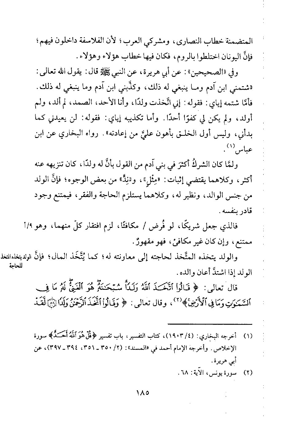 ولمّا كان الشركُ أكثرُ في بني آدم من القول بأنّ له ولداً، كان تنزيهه عنه أكثر. وكلاهما يقتضي إثبات: (مِثْلٍ) ، و (نِدّ) من بعض الوجوه؛ فإنّ الولد من جنس الوالد، ونظير له، وكلاهما يستلزم الحاجة والفقر، فيمتنع وجود قادر بنفسه.