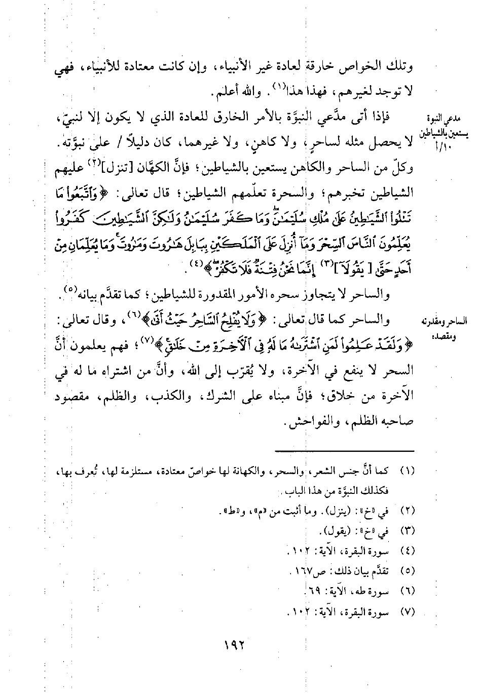 فإذا أتى مدّعي النبوّة بالأمر الخارق للعادة الذي لا يكون إلا لنبيّ، لا يحصل مثله لساحرٍ، ولا كاهنٍ، ولا غيرهما، كان دليلاً على نبوّته. وكلّ من الساحر، والكاهن يستعين بالشياطين؛ فإنّ الكهّان [تنزل] 2 عليهم الشياطين تخبرهم؛ والسحرة تعلّمهم الشياطين؛ قال تعالى: {وَاتَّبَعُوا مَا تَتْلُو الشَّيَاطِينُ عَلَى مُلْكِ سُلَيْمَانَ وَمَا كَفَرَ سُلَيْمَانُ وَلَكِنَّ الشَّيَاطِينَ كَفَرُوا يُعَلِّمُونَ النَّاسَ السِّحْرَ وَمَا أُنْزِلَ عَلَى المَلَكَيْنِ بِبَابِلَ هَارُوتَ وَمَارُوتَ وَمَا يُعَلِّمَانِ مِنْ أَحَدٍ حَتَّى [يَقُولا] 3 إِنَّمَا نَحْنُ فِتْنَةٌ فَلا تَكْفُرْ} 4.