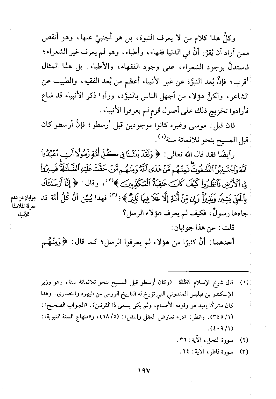 وأيضاً فقد قال الله تعالى: {وَلَقَدْ بَعَثْنَا في كُلّ أُمَّةٍ رَسُولاً أَنِ اعْبُدُوا اللهَ وَاجْتَنِبُوا الطَّاغُوت فَمِنْهُم مَنْ هَدَى الله وَمِنْهُم مَنْ حَقَّتْ عَلَيْهِ الضَّلالَة فَسِيرُوا في الأَرْضِ فَانْظُرُوا كَيْفَ كَانَ عَاقِبَةُ المُكَذِّبِينَ} 2، وقال: {إِنَّا أَرْسَلْنَاكَ بِالحَقِّ بَشِيرَاً وَنَذِيرَاً وَإِنْ مِنْ أُمَّةٍ إِلاَّ خَلا فِيهَا نَذِير} 3؛ فهذا يُبيِّن أنّ كُلّ أمّة قد جاءها رسولٌ، فكيف لم يعرف هؤلاء الرسل؟.