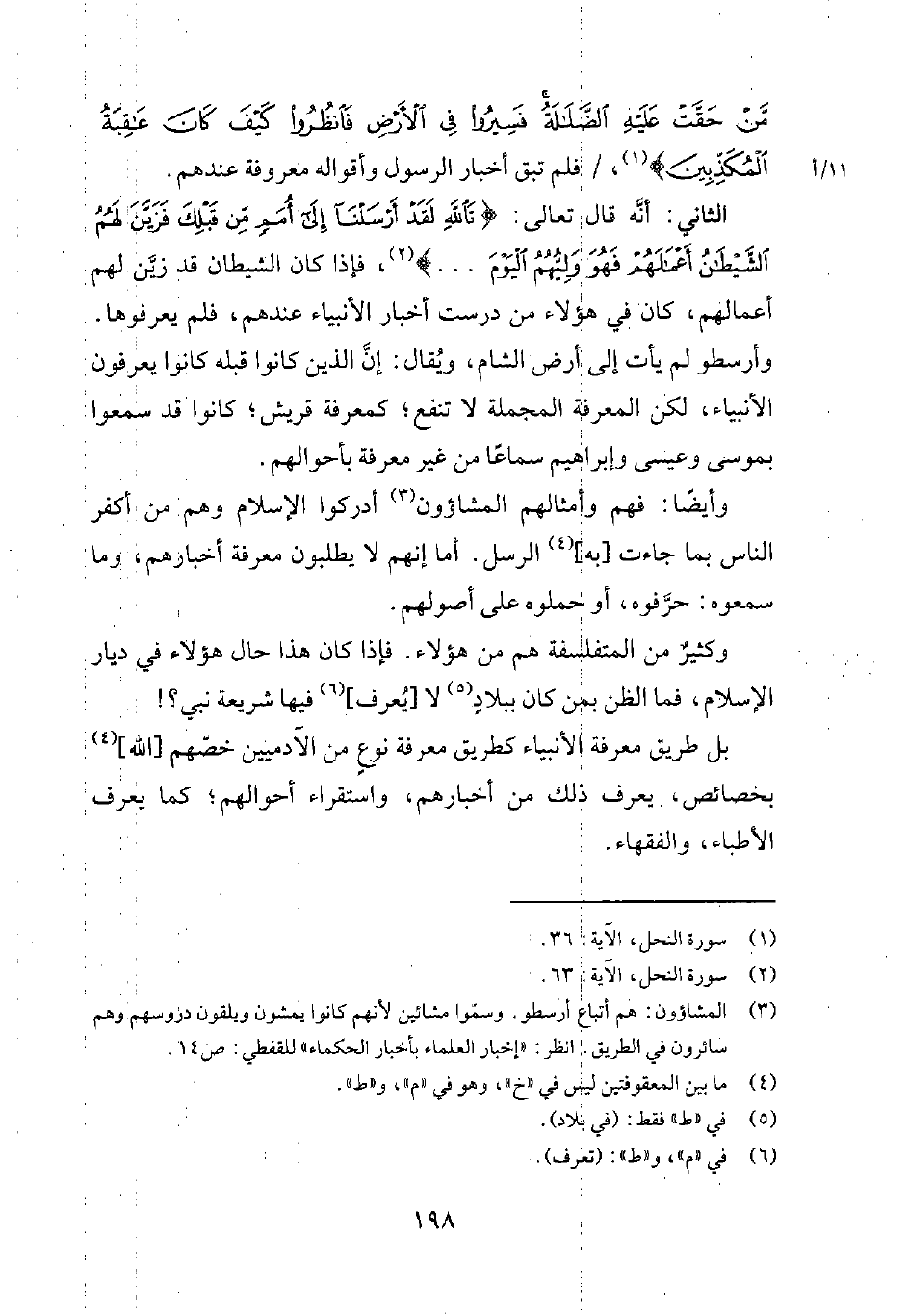 الثاني: أنّه قال تعالى: {تَاللهِ لَقَدْ أَرْسَلْنَا إِلَى أُمَمٍ مِنْ قَبْلِكَ فَزَيَّنَ لَهُمُ الشَّيْطَانُ أَعْمَالَهُم فَهُوَ وَلِيّهُمُ اليَوْمَ} 2، فإذا كان الشيطان قد زيّن لهم أعمالهم، كان في هؤلاء من درست أخبار الأنبياء عندهم، فلم يعرفوها. وأرسطو لم يأت إلى أرض الشام، ويُقال: إنّ الذين كانوا قبله كانوا يعرفون الأنبياء، لكن المعرفة المجملة لا تنفع؛ كمعرفة قريش؛ كانوا قد سمعوا بموسى، وعيسى، وإبراهيم سماعاً من غير معرفة بأحوالهم.