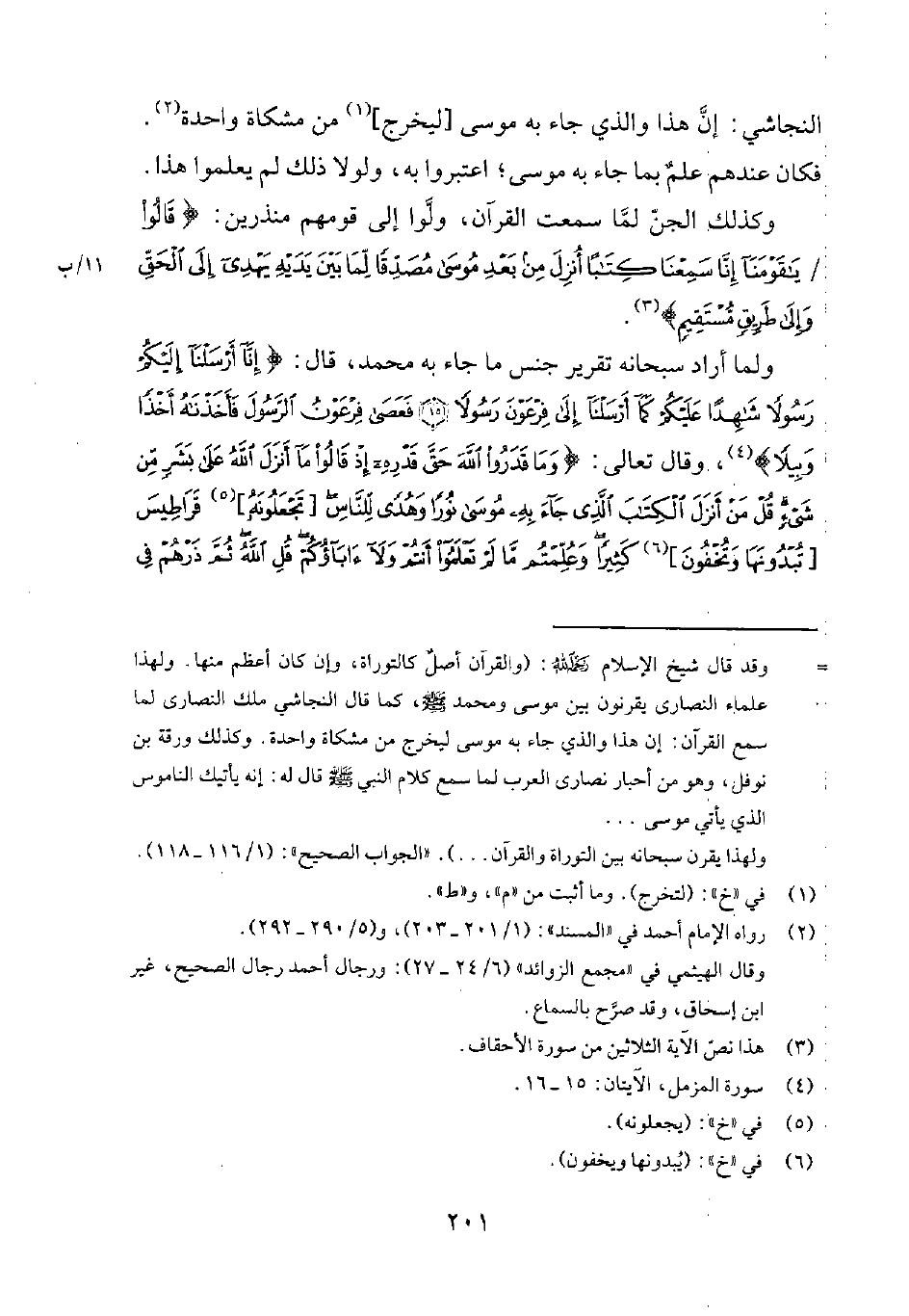 ولما أراد سبحانه تقرير جنس ما جاء به محمد، قال: {إِنَّا أَرْسَلْنَا إِلَيْكُمْ رَسُولاً شَاهِدَاً عَلَيْكُمْ كَمَا أَرْسَلْنَا إِلَى فِرْعَوْنَ رَسُولاًفَعَصَى فِرْعَوْنُ الرَّسُولَ فَأَخَذْنَاهُ أَخْذَاً وَبِيلاً} 4، وقال تعالى: {وَمَا قَدَرُوا اللهَ حَقَّ قَدْرِهِ إِذْ قَالُوا مَا أَنْزَلَ اللهُ عَلَى بَشَرٍ مِنْ شَيْءٍ قُلْ مَنْ أَنْزَلَ الكِتَابَ الَّذِي جَاءَ بِهِ مُوسَى نُوراً وَهُدَى لِلنَّاسِ [تَجْعَلُونَهُ] 5 قَرَاطِيسَ [تُبْدُونَهَا وَتُخْفُونَ] 6 كَثِيرَاً وَعُلِّمْتُمْ مَا لَمْ تَعْلَمُوا أَنْتُمْ وَلا آبَاؤُكُمْ قُلِ اللهُ ثُمَّ ذَرْهُمْ في