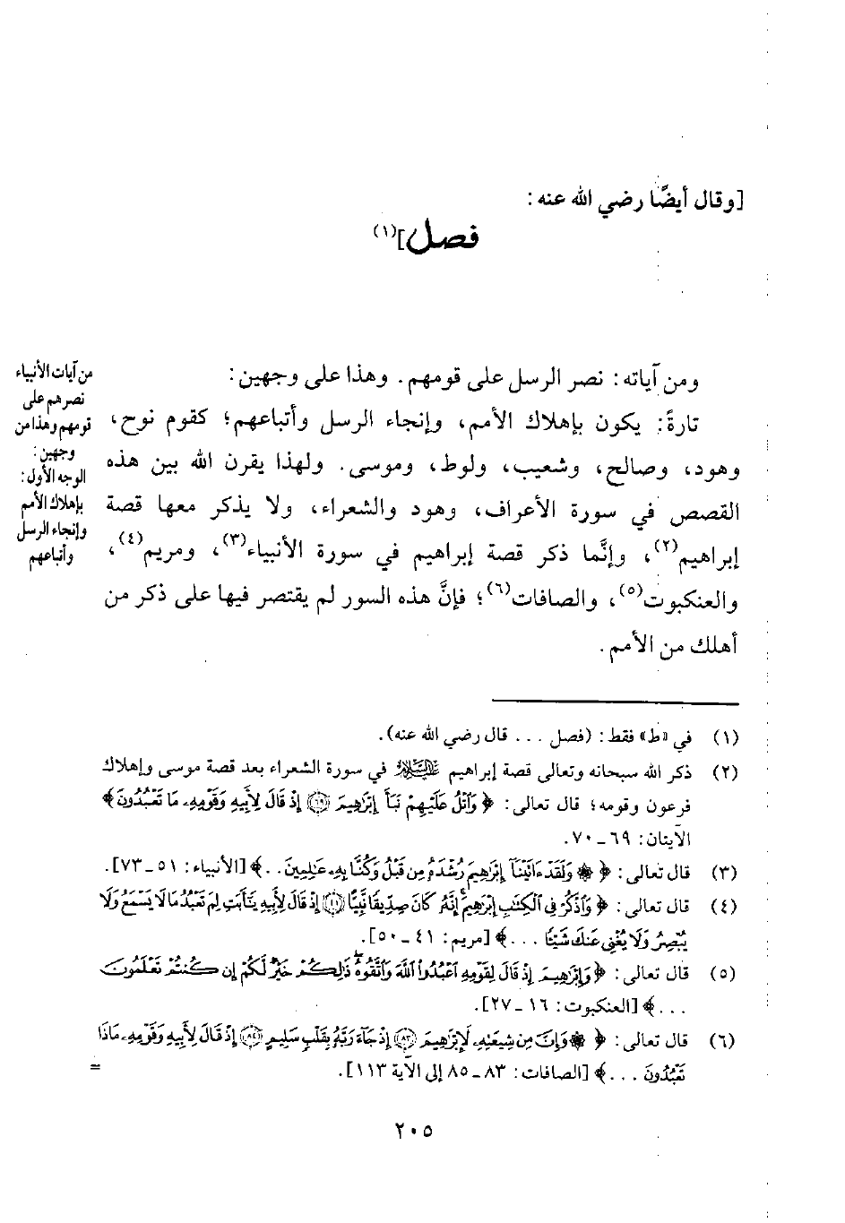 تارةً: يكون بإهلاك الأمم، وإنجاء الرسل وأتباعهم؛كقوم نوح، وهود، وصالح، وشعيب، ولوط، وموسى. ولهذا يقرن الله بين هذه القصص في سورة الأعراف، وهود، والشعراء، ولا يذكر معها قصة إبراهيم2. وإنّما ذكر قصة إبراهيم في سورة الأنبياء3، ومريم4، والعنكبوت5، والصافات6؛ فإنّ هذه السور لم يقتصر فيها على ذكر من أهلك من الأمم.