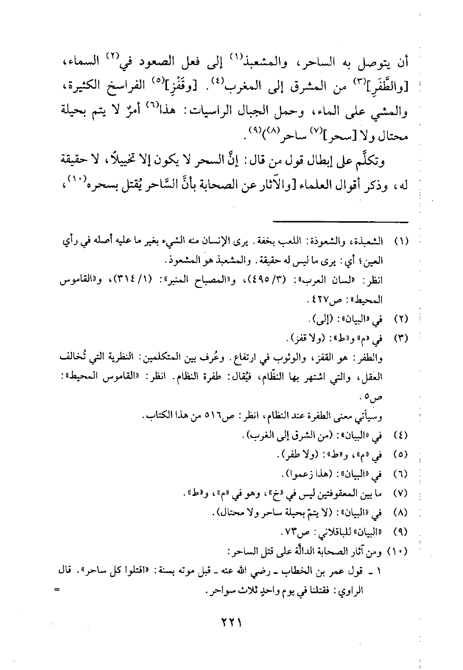 وتكلّم على إبطال قول من قال: إنّ السحر لا يكون إلا تخييلاً، لا حقيقة له، وذكر أقوال العلماء [والآثار عن الصحابة بأنّ السّاحر يُقتل بسحره10،