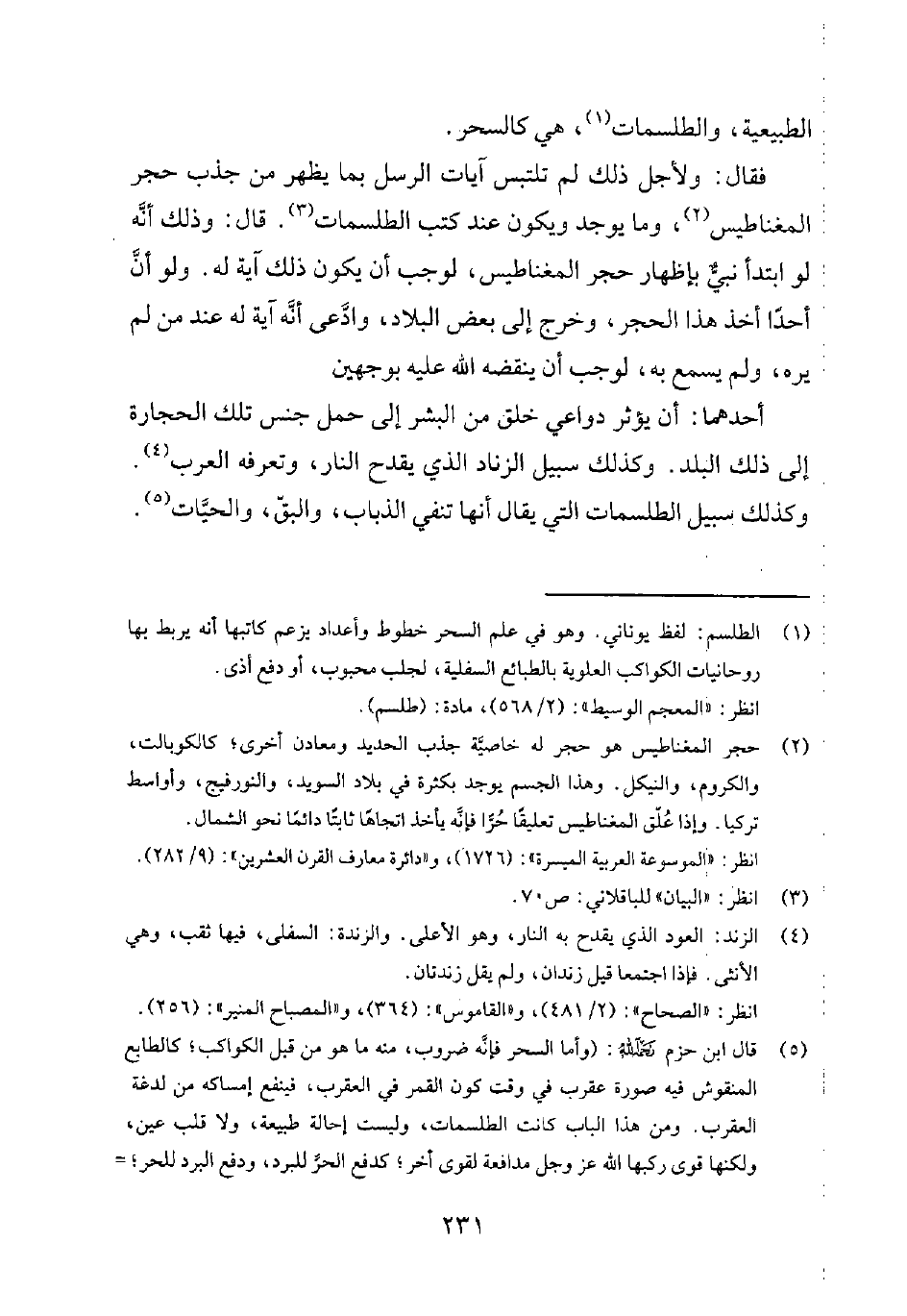 5 قال ابن حزم رحمه الله: "وأما السحر فإنه ضروب، منه ما هو من قبل الكواكب؛ كالطابع المنقوش فيه صورة عقرب في وقت كون القمر في العقرب، فينفع إمساكه من لدغة العقرب. ومن هذا الباب كانت الطلسمات، وليست إحالة طبيعة، ولا قلب عين، ولكنها قوى ركبها الله عز وجل مدافعة لقوى أخر؛ كدفع الحرّ للبرد، ودفع البرد للحرّ؛ وكقتل القمر للدابة الدبرة إذا لاقى الدبرة ضوءه إذا كانت دبرتها مكشوفة للقمر. ولا يمكن دفع الطلسمات لأننا قد شاهدنا بأنفسنا آثارها ظاهرة إلى الآن من قرى لا تدخلها جرادة، ولا يقع فيه برد ... ". إلى أن قال: "ومنه ما يكون بالخاصة؛ كالحجر الجاذب للحديد، وما أشبه ذلك. ومنه ما يكون لطف يد..". الفصل في الملل والأهواء والنحل 5/4.