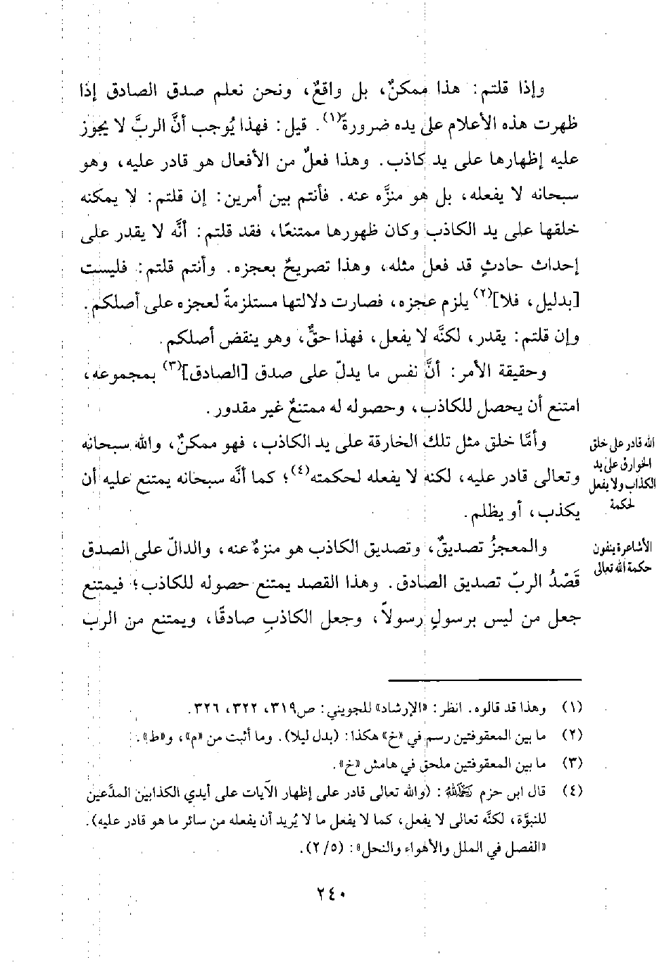 وأمّا خلق مثل تلك الخارقة على يد الكاذب، فهو ممكنٌ، والله سبحانه وتعالى قادر عليه، لكنه لا يفعله لحكمته4؛ كما أنّه سبحانه يمتنع عليه أن يكذب، أو يظلم.