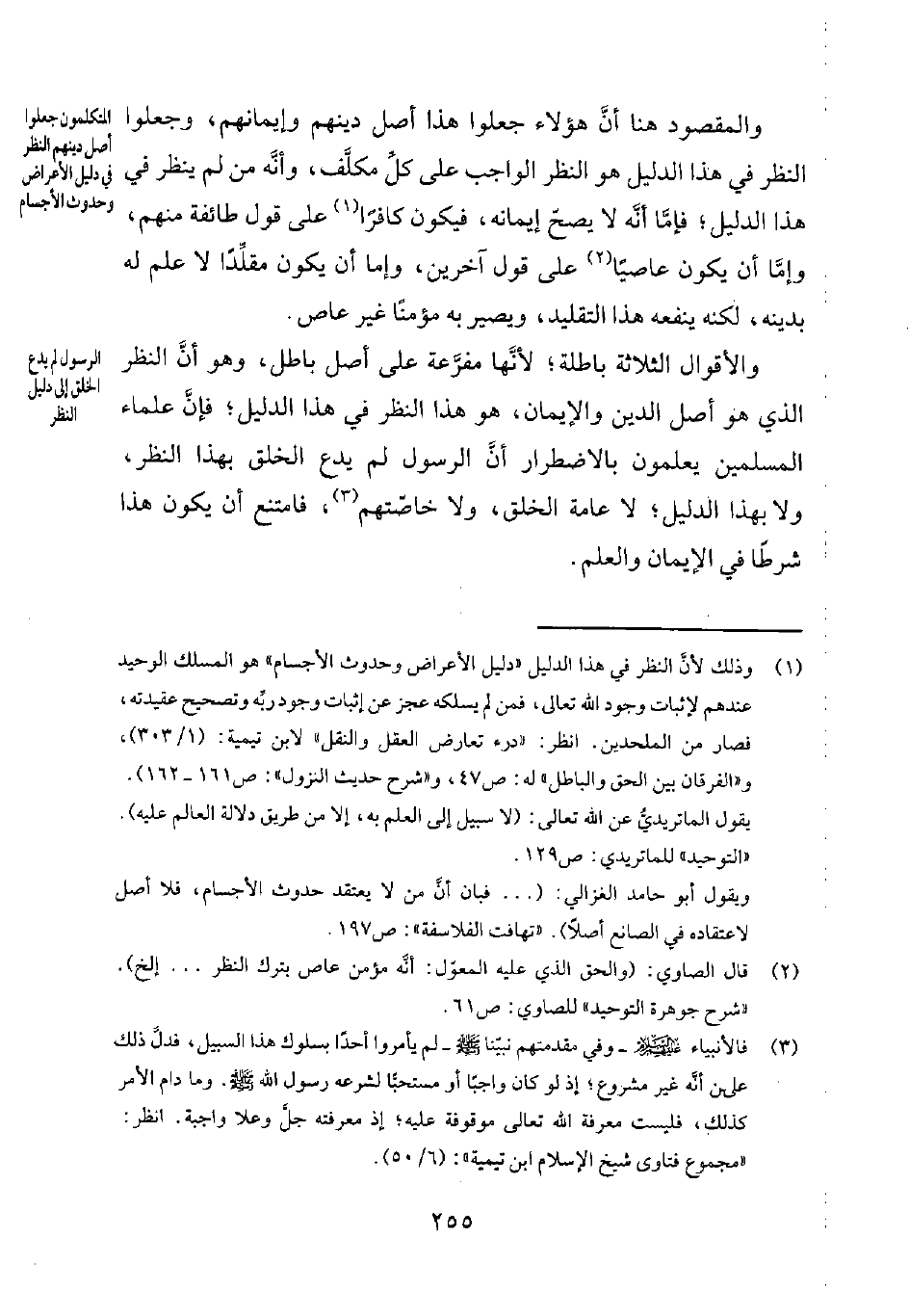 والأقوال الثلاثة باطلة؛ لأنّها مفرّعة على أصل باطل، وهو أنّ النظر الذي هو أصل الدين والإيمان، هو هذا النظر في هذا الدليل؛ فإنّ علماء المسلمين يعلمون بالاضطرار أنّ الرسول لم يدع الخلق بهذا النظر، ولا بهذا الدليل؛ لا عامة الخلق، ولا خاصّتهم3، فامتنع أن يكون هذا شرطاً في الإيمان والعلم.