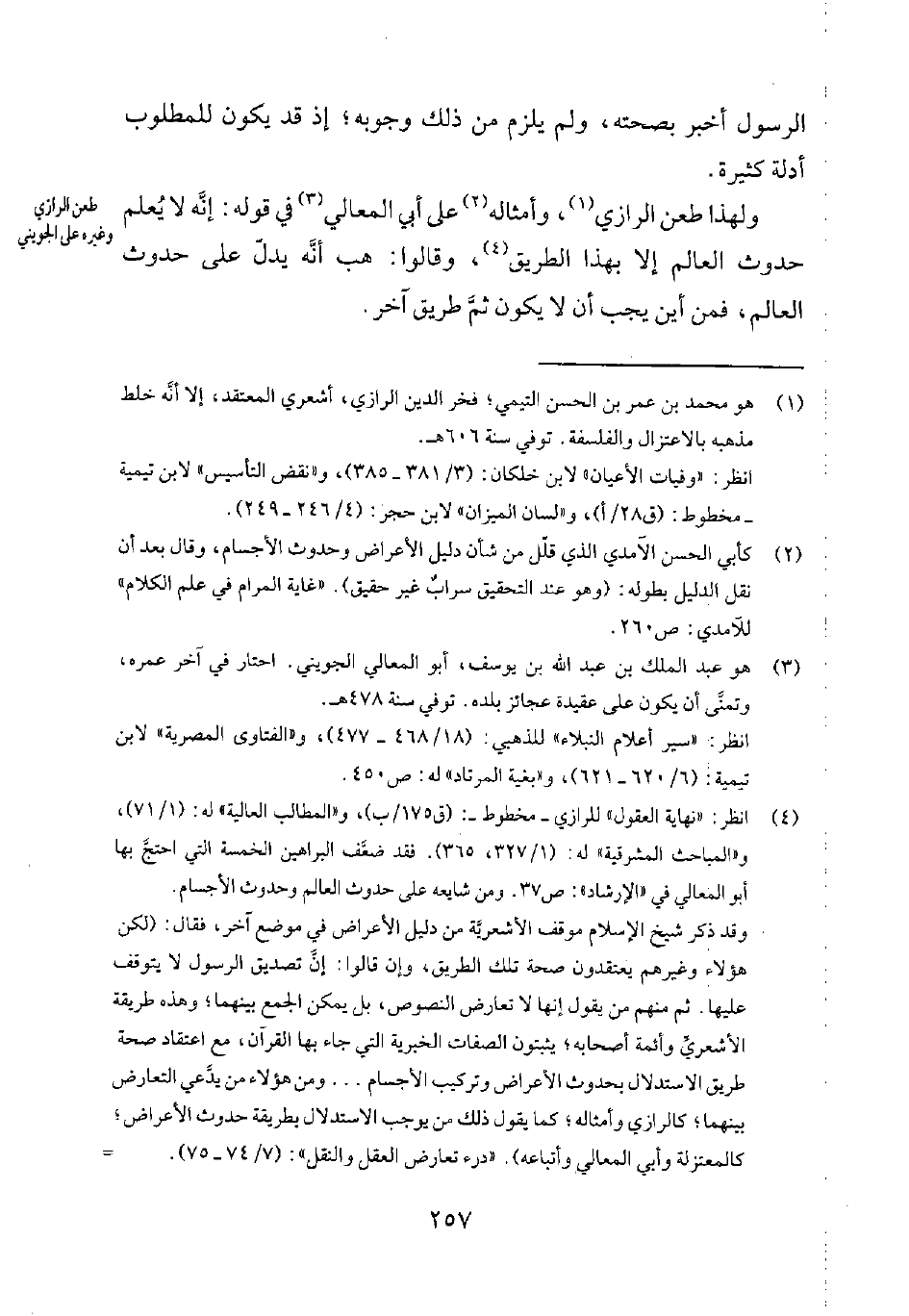 4 انظر: نهاية العقول للرازي - مخطوط - ق 175/ب. والمطالب العالية له 1/71. والمباحث المشرقية له 1/327، 365. "فقد ضعّف البراهين الخمسة التي احتجّ بها أبو المعالي - في الإرشاد ص 37 - ومن شايعه على حدوث العالم وحدوث الأجسام".