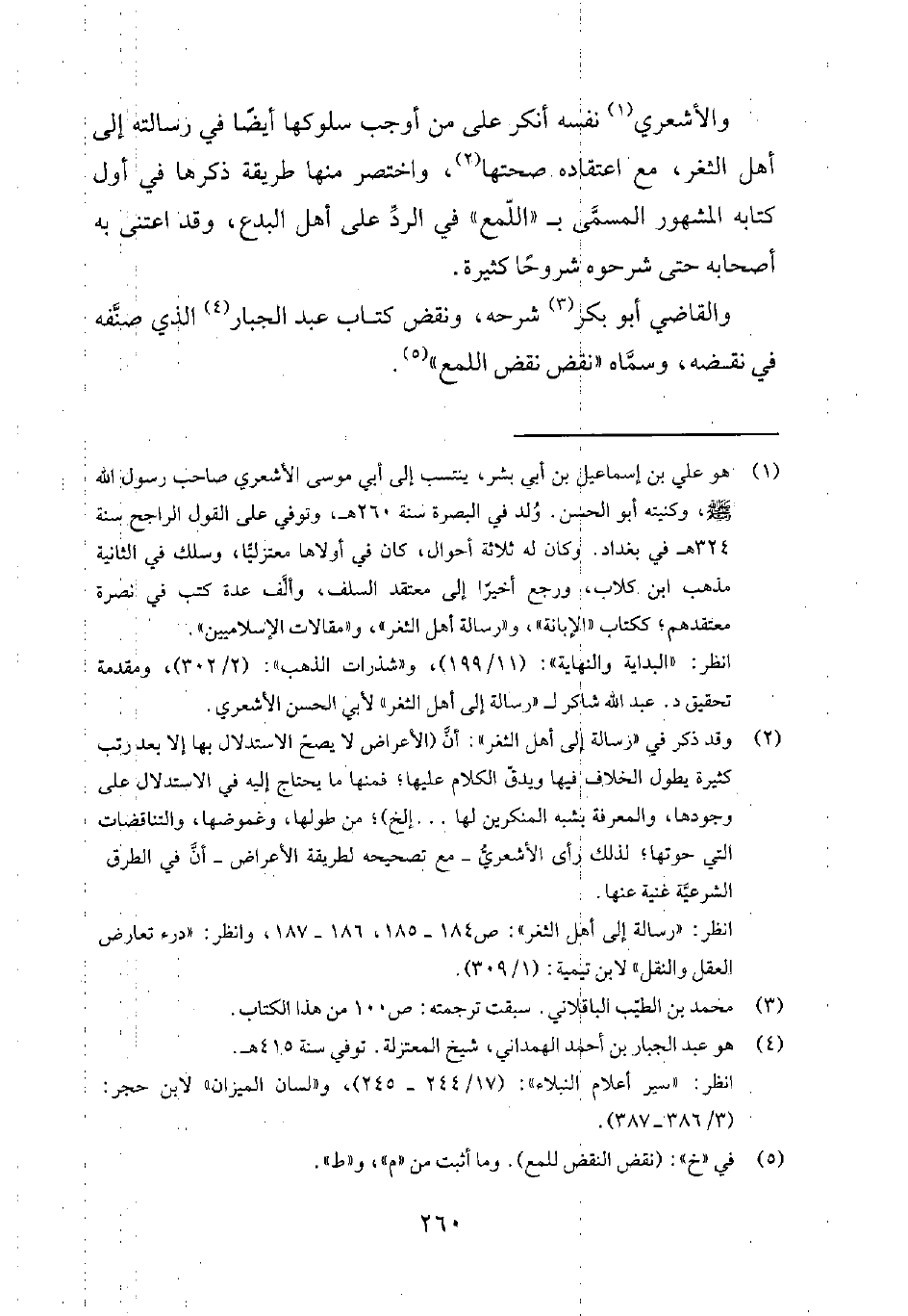 والأشعري1 نفسه أنكر على من أوجب سلوكها أيضاً في رسالته إلى أهل الثغر، مع اعتقاده صحتها2، واختصر منها طريقة ذكرها في أول كتابه المشهور المسمّى ب ((اللّمع)) في الردّ على أهل البدع، وقد اعتنى به أصحابه حتى شرحوه شروحاً كثيرة. والقاضي أبو بكر3 شرحه، ونقض كتاب عبد الجبار4 الذي صنّفه في نقضه، وسمّاه ((نقض نقض اللمع)) 5.