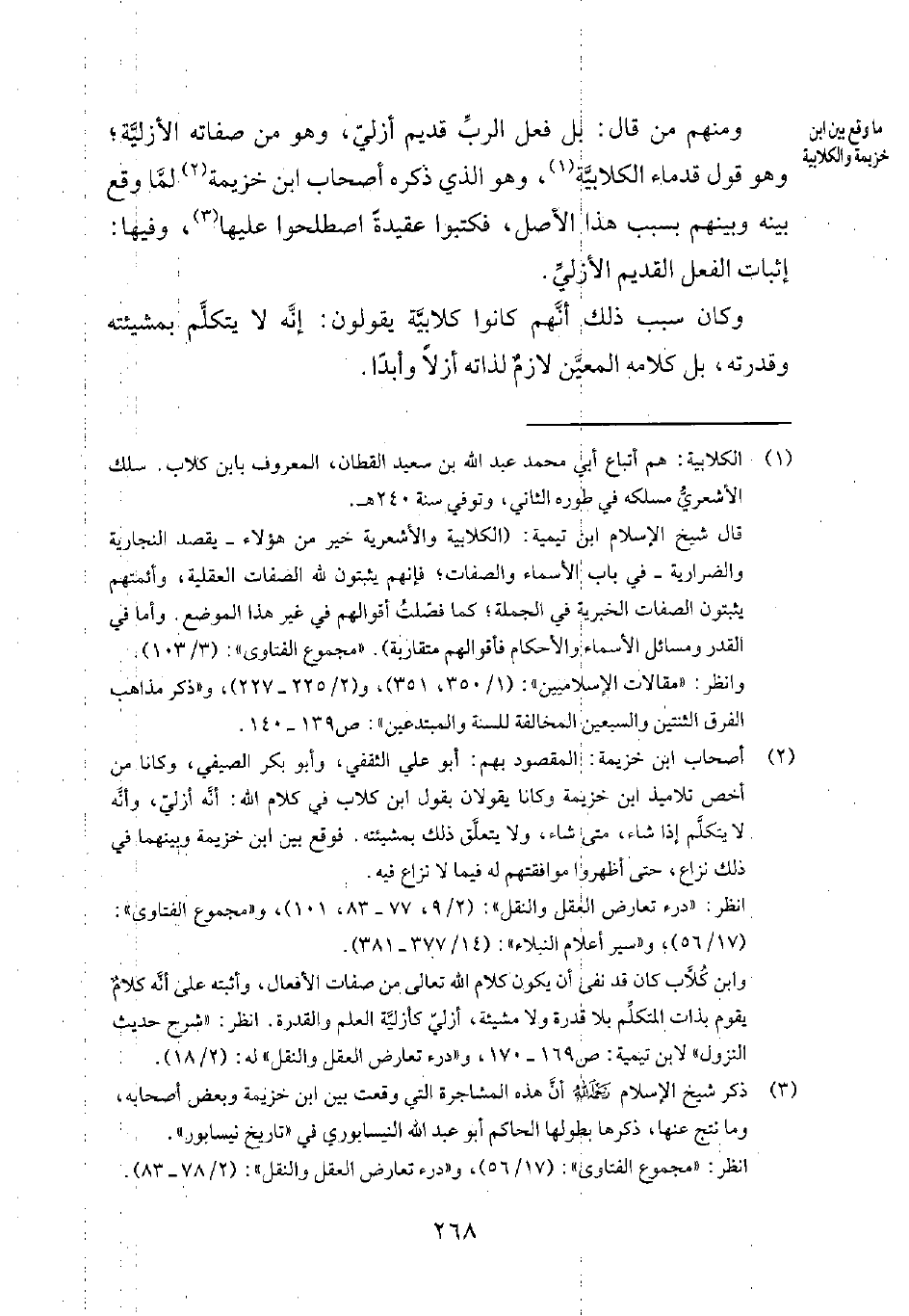 2 أصحاب ابن خزيمة: المقصود بهم: أبو علي الثقفي، وأبو بكر الصيفي، وكانا من أخص تلاميذ ابن خزيمة وكانا يقولان بقول ابن كلاب في كلام الله: أنّه أزليّ، وأنّه لا يتكلّم إذا شاء، متى شاء، ولا يتعلّق ذلك بمشيئته. فوقع بين ابن خزيمة وبينهما في ذلك نزاع، حتى أظهروا موافقتهم له فيما لا نزاع فيه.