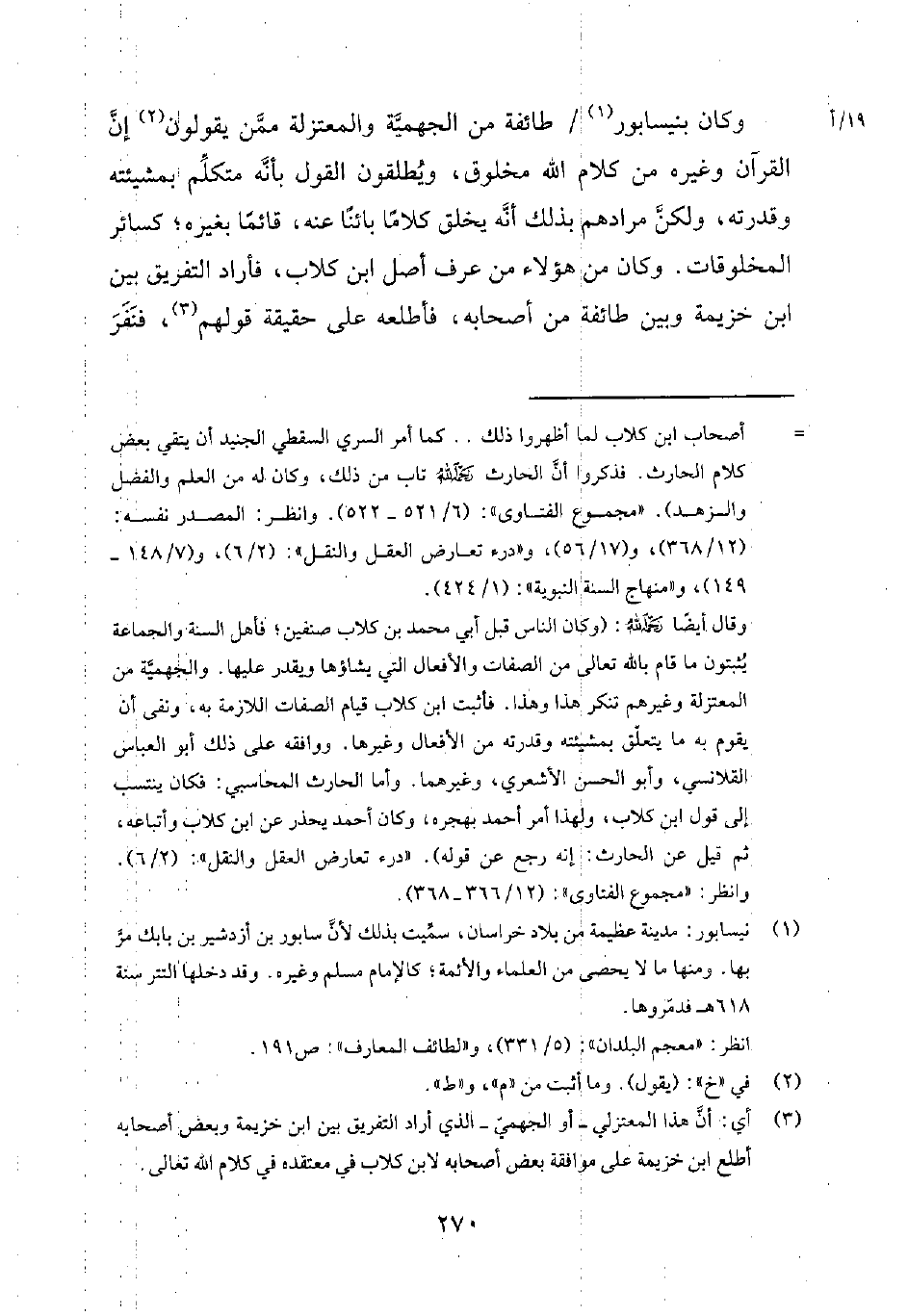 وكان بنيسابور1 طائفة من الجهميّة والمعتزلة ممّن يقولون2 إنّ القرآن وغيره من كلام الله مخلوق، ويُطلقون القول بأنّه متكلّم بمشيئته وقدرته، ولكنّ مرادهم بذلك أنّه يخلق كلاماً بائناً عنه، قائماً بغيره؛ كسائر المخلوقات. وكان من هؤلاء من عرف أصل ابن كلاب، فأراد التفريق بين ابن خزيمة وبين طائفة من أصحابه، فأطلعه على حقيقة قولهم3، فنَفَرَ