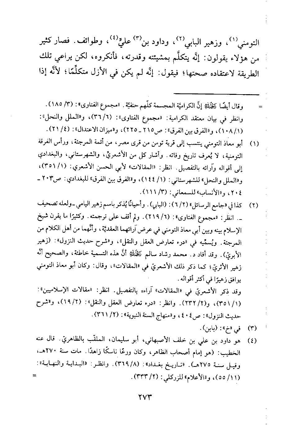 التومني1، وزهير البابي2، وداود بن3 عليّ4، وطوائف. فصار كثير من هؤلاء يقولون: إنّه يتكلّم بمشيئته وقدرته، فأنكروه، لكن يراعي تلك الطريقة لاعتقاده صحتها؛ فيقول: إنّه لم يكن في الأزل متكلّماً؛ لأنّه إذا