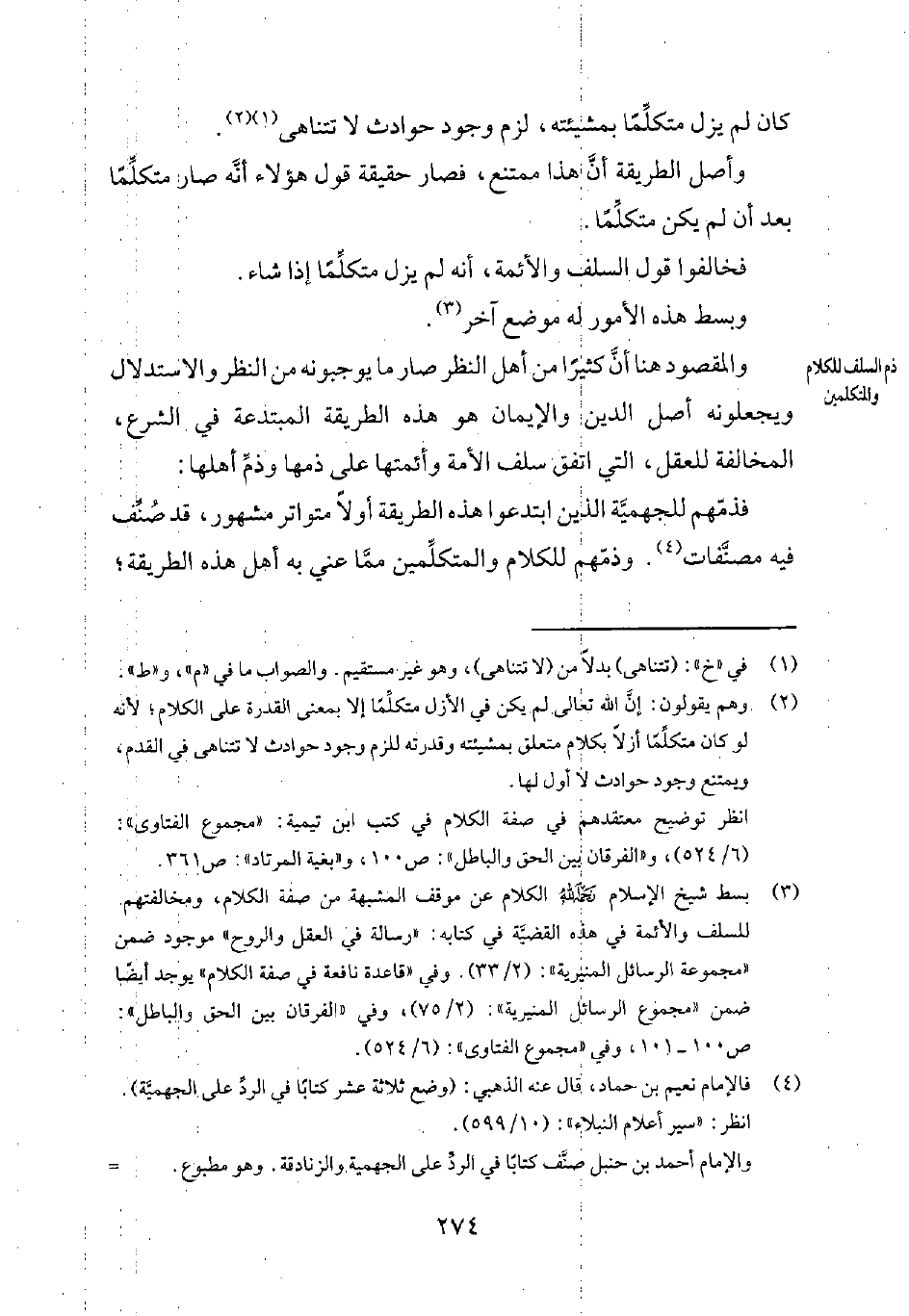 3 بسط شيخ الإسلام رحمه الله الكلام عن موقف المشبهة من صفة الكلام، ومخالفتهم للسلف والأئمة في هذه القضيّة في كتابه: رسالة في العقل والروح - موجود ضمن مجموعة الرسائل المنيرية 2/33 -. وفي قاعدة نافعة في صفة الكلام - يوجد أيضاً ضمن مجموعة الرسائل المنيرية 2/75 -. وفي الفرقان بين الحق والباطل ص100-101. وفي مجموع الفتاوى 6/524.