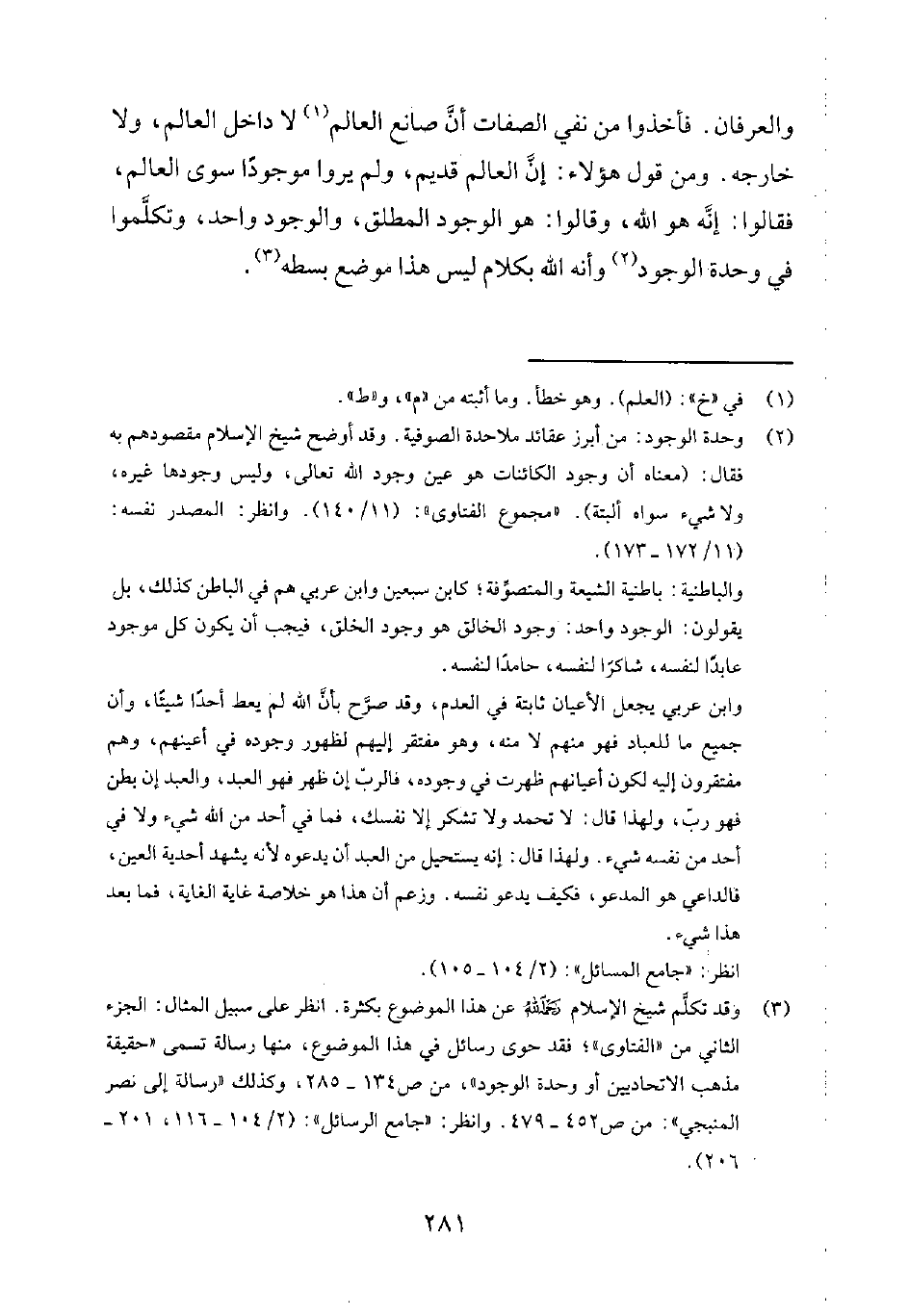 3 وقد تكلّم شيخ الإسلام رحمه الله عن هذا الموضوع بكثرة. انظر: على سبيل المثال: الجزء الثاني من الفتاوى؛ فقد حوى رسائل في هذا الموضوع، منها رسالة تسمى ((حقيقة مذهب الاتحاديين أو وحدة الوجود)) من ص 134-285، وكذلك ((رسالة إلى نصر المنبجي)) من ص 452-479. وانظر: جامع الرسائل 2/104-116، 201-206.