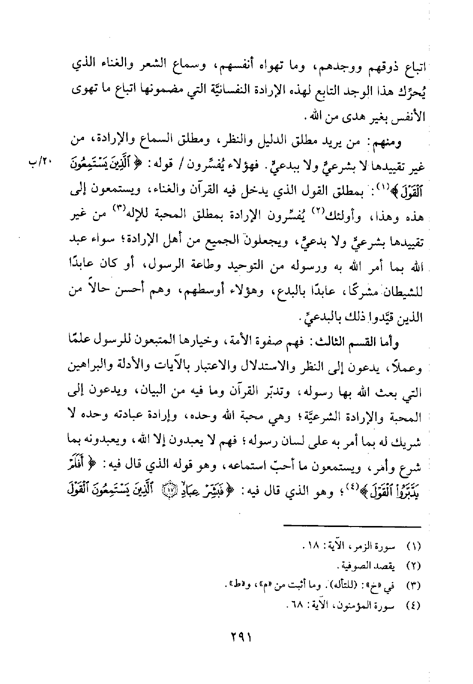 ومنهم: من يريد مطلق الدليل والنظر، ومطلق السماع والإرادة، من غير تقييدها لا بشرعيّ ولا ببدعيّ. فهؤلاء يُفسّرون قوله: {الَّذِيْنَ يَسْتَمِعُوْنَ الْقَوْلَ} 1: بمطلق القول الذي يدخل فيه القرآن والغناء، ويستمعون إلى هذه وهذا، وأولئك2 يُفسّرون الإرادة بمطلق المحبة للإله3 من غير تقييدها بشرعيّ ولا بدعيّ، ويجعلون الجميع من أهل الإرادة؛ سواء عبد الله بما أمر الله به ورسوله من التوحيد وطاعة الرسول، أو كان عابداً للشيطان مشركاً، عابداً بالبدع، وهؤلاء أوسطهم، وهم أحسن حالاً من الذين قيّدوا ذلك بالبدعيّ
