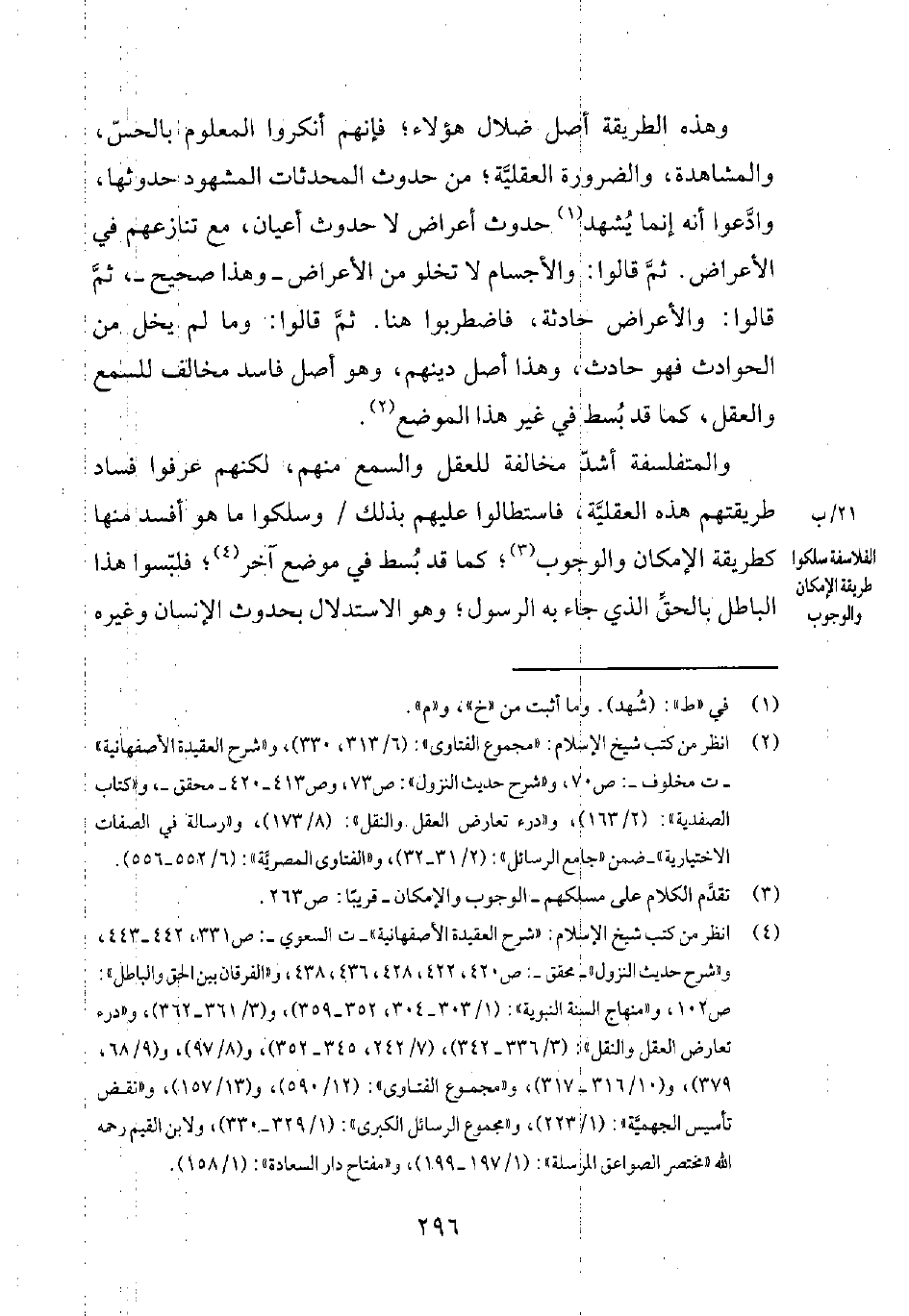 4 انظر: من كتب شيخ الإسلام: شرح العقيدة الأصفهانية - ت السعوي - ص 331، 442-443. وشرح حديث النزول - محقق - ص 420، 422، 428، 436، 438. والفرقان بين الحق والباطل ص 102. ومنهاج السنة النبوية 1/303-304، 352-359، و3/361-362. ودرء تعارض العقل والنقل 3/336-342، 7/242، 345-352، 8/97، 9/68، 379، و10/316-317. ومجموع الفتاوى 12/590، 13/157. ونقض تأسيس الجهميّة 1/223، ومجموع الرسائل الكبرى 1/329-330، ولابن القيم رحمه: مختصر الصواعق المرسلة 1/197-199، ومفتاح دار السعادة 1/158.