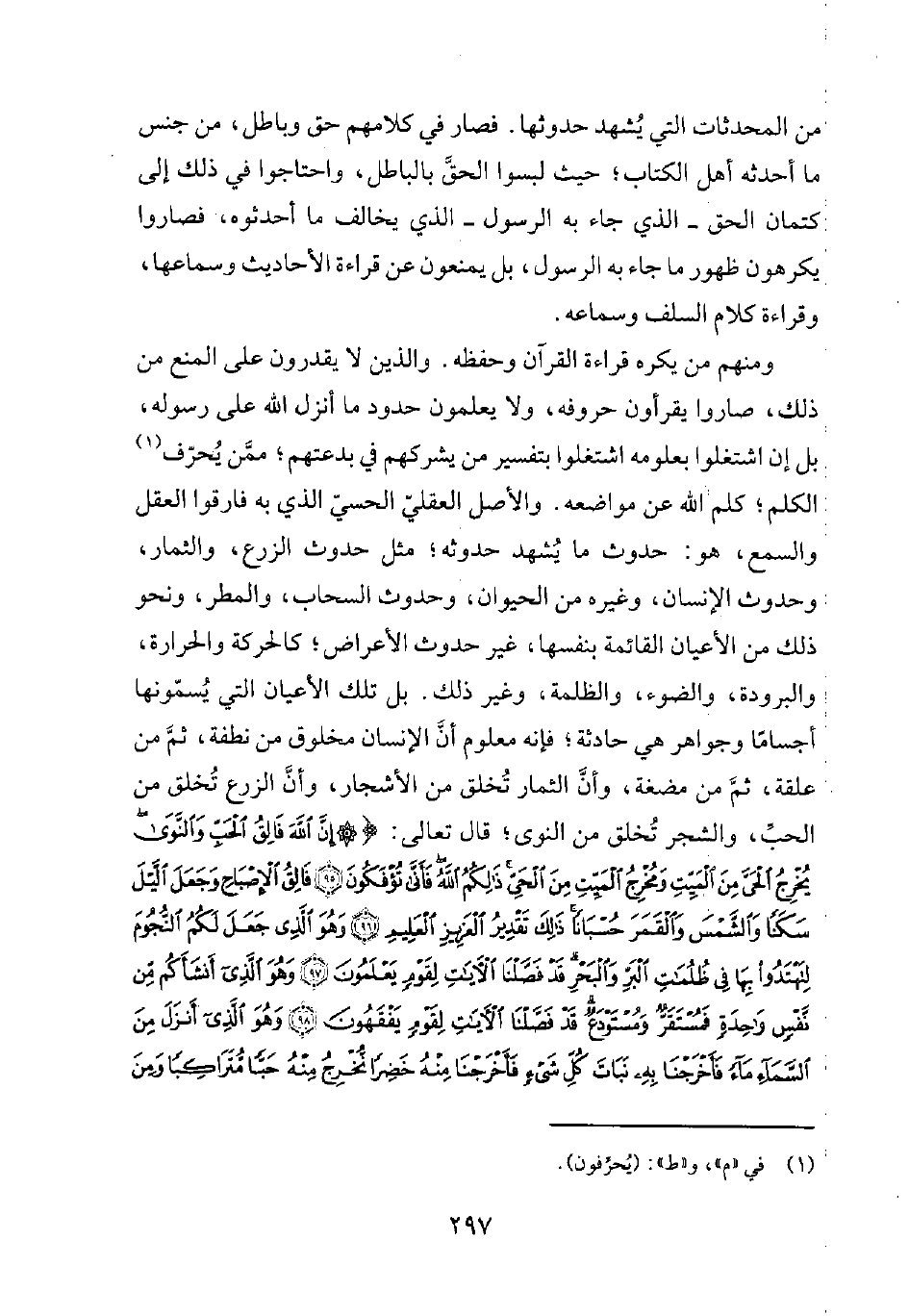 ومنهم من يكره قراءة القرآن وحفظه. والذين لا يقدرون على المنع من ذلك، صاروا يقرأون حروفه، ولا يعلمون حدود ما أنزل الله على رسوله، بل إن اشتغلوا بعلومه اشتغلوا بتفسير من يشركهم في بدعتهم؛ ممّن يُحرّف1 الكلم؛ كلم الله عن مواضعه. والأصل العقليّ الحسيّ الذي به فارقوا العقل والسمع، هو: حدوث ما يُشهد حدوثه؛ مثل حدوث الزرع، والثمار، وحدوث الإنسان، وغيره من الحيوان، وحدوث السحاب، والمطر، ونحو ذلك من الأعيان القائمة بنفسها، غير حدوث الأعراض؛ كالحركة، والحرارة، والبرودة، والضوء، والظلمة، وغير ذلك. بل تلك الأعيان التي يُسمّونها أجساماً وجواهر هي حادثة؛ فإنه معلوم أنّ الإنسان مخلوق من نطفة، ثمّ من علقة، ثمّ من مضغة، وأنّ الثمار تُخلق من الأشجار، وأنّ الزرع تُخلق من الحبّ، والشجر تُخلق من النوى؛ قال
