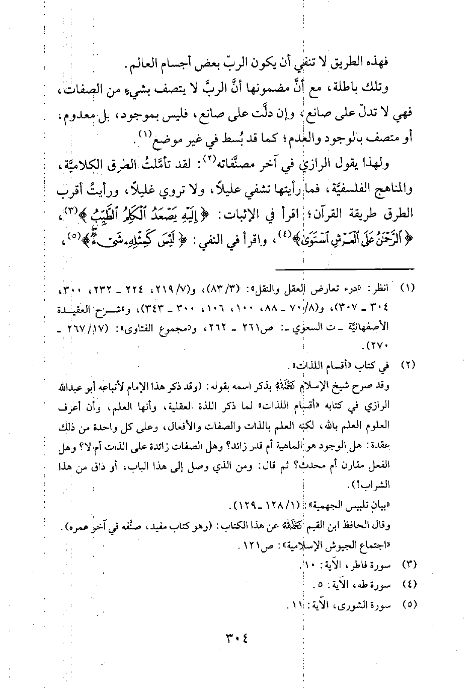 ولهذا يقول الرازي في آخر مصنّفاته2: لقد تأمّلتُ الطرق الكلاميّة، والمناهج الفلسفيّة، فما رأيتُها تشفي عليلاً، ولا تروي غليلاً، ورأيتُ أقرب الطرق طريقة القرآن؛ اقرأ في الإثبات: {إِلَيْهِ يَصْعَدُ الْكَلِمُ الطَّيِّبُ} 3، {الرَّحْمَنُ عَلَىْ الْعرْشِ استَوَىْ} 4، واقرأ في النفي: {لَيْسَ كَمِثْلِهِ شيْءٌ} 5،