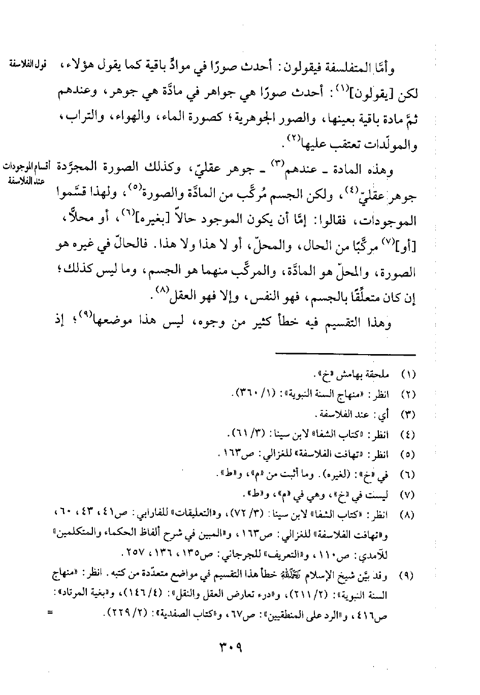 وهذه المادة - عندهم3 - جوهر عقليّ، وكذلك الصورة المجرّدة جوهر عقليّ4، ولكن الجسم مُركّب من المادّة والصورة5، ولهذا قسّموا الموجودات، فقالوا: إما أن يكون الموجود حالا [بغيره] 6، أو محلا، أو مركبا من الحال، والمحل، [أو] 7 لا هذا ولا هذا. فالحال في غيره هو الصورة، والمحلّ هو المادّة، والمركّب منهما هو الجسم، وما ليس كذلك؛ إن كان متعلّقاً بالجسم، فهو النفس، وإلا فهو العقل8.
