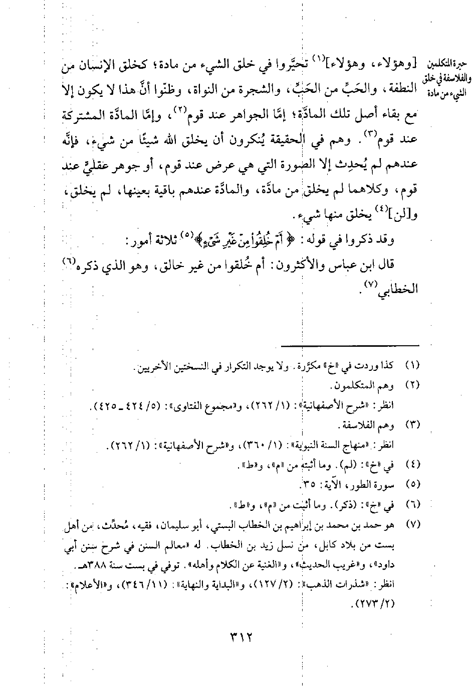 [وهؤلاء، وهؤلاء] 1 تحيّروا في خلق الشيء من مادة؛ كخلق الإنسان من النطفة، والحب من الحب، والشجرة من النواة، وظنّوا أنّ هذا لا يكون إلا مع بقاء أصل تلك المادّة؛ إمّا الجواهر عند قوم2، وإمّا المادّة المشتركة عند قوم3. وهم في الحقيقة يُنكرون أن يخلق الله شيئاً من شيء؛ فإنّه عندهم لم يُحدِث إلا الصورة التي هي عرض عند قوم، أو جوهر عقليّ عند قوم. وكلاهما لم يخلق من مادّة، والمادّة عندهم باقية بعينها، لم يخلق، و [لن] 4 يخلق منها شيء.