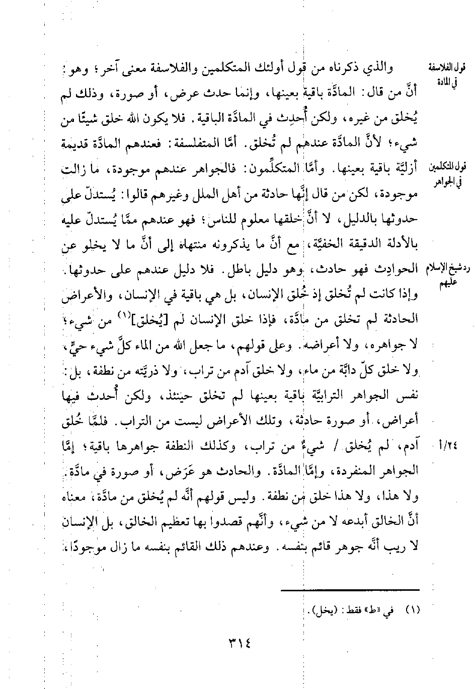 والذي ذكرناه من قول أولئك المتكلمين والفلاسفة معنى آخر؛ وهو: أنّ من قال المادّة باقية بعينها، وإنما حدث عرض، أو صورة، وذلك لم يُخلق من غيره، ولكن أُحدِث في المادّة الباقية. فلا يكون الله خلق شيئاً من شيء؛ لأنّ المادّة عندهم لم تُخلق. أمّا المتفلسفة: فعندهم المادّة قديمة أزليّة باقية بعينها.