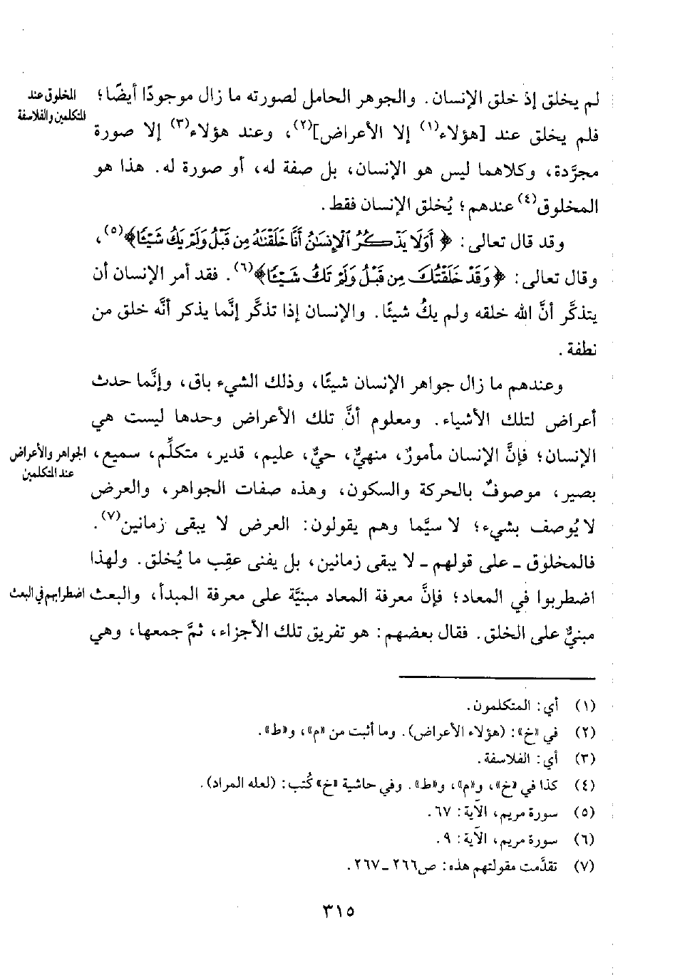 وعندهم ما زال جواهر الإنسان شيئاً، وذلك الشيء باق، وإنّما حدث أعراض لتلك الأشياء. ومعلوم أنّ تلك الأعراض وحدها ليست هي الإنسان؛ فإنّ الإنسان مأمورٌ، منهيّ، حيّ، عليم، قدير، متكلّم، سميع، بصير، موصوفٌ بالحركة والسكون. وهذه صفات الجواهر، والعرض لا يُوصف بشيء؛ لا سيّما وهم يقولون: العرض لا يبقى زمانين7. فالمخلوق - على قولهم - لا يبقى زمانين، بل يفنى عقِب ما يُخلق.