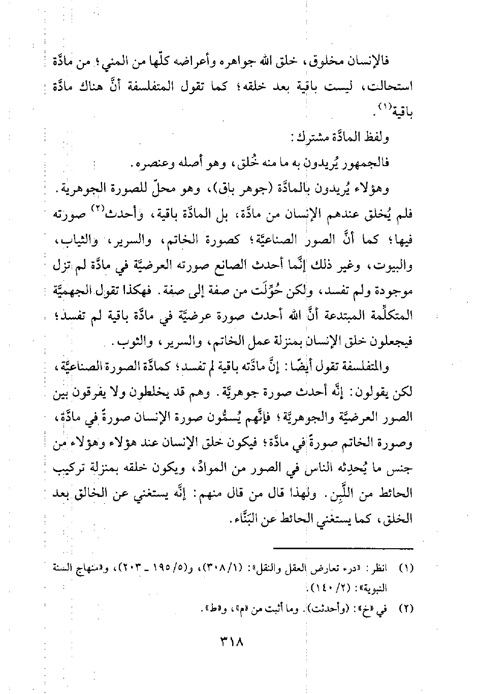 وهؤلاء يُريدون بالمادّة جوهر باق، وهو محلّ للصورة الجوهرية. فلم يُخلق عندهم الإنسان من مادّة، بل المادّة باقية، وأحدث2 صورته فيها؛ كما أنّ الصور الصناعيّة؛ كصورة الخاتم، والسرير، والثياب، والبيوت، وغير ذلك إنّما أحدث الصانع صورته العرضيّة في مادّة لم تزل موجودة ولم تفسد، ولكن حُوِّلَت من صفة إلى صفة. فهكذا تقول الجهميّة المتكلّمة المبتدعة أنّ الله أحدث صورة عرضيّة في مادّة باقية لم تفسد؛ فيجعلون خلق الإنسان بمنزلة عمل الخاتم، والسرير، والثوب.