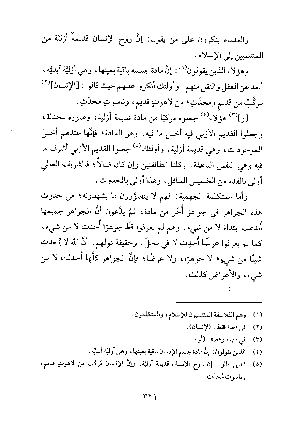 وهؤلاء الذين يقولون1 إنّ مادة جسمه باقية بعينها، وهي أزليّة أبديّة، أبعد عن العقل والنقل منهم. وأولئك أنكروا عليهم حيث قالوا: [الإنسان] 2 مركّبٌ من قديمٍ ومحدَثٍ؛ من لاهوتٍ قديم، وناسوتٍ محدَثٍ.