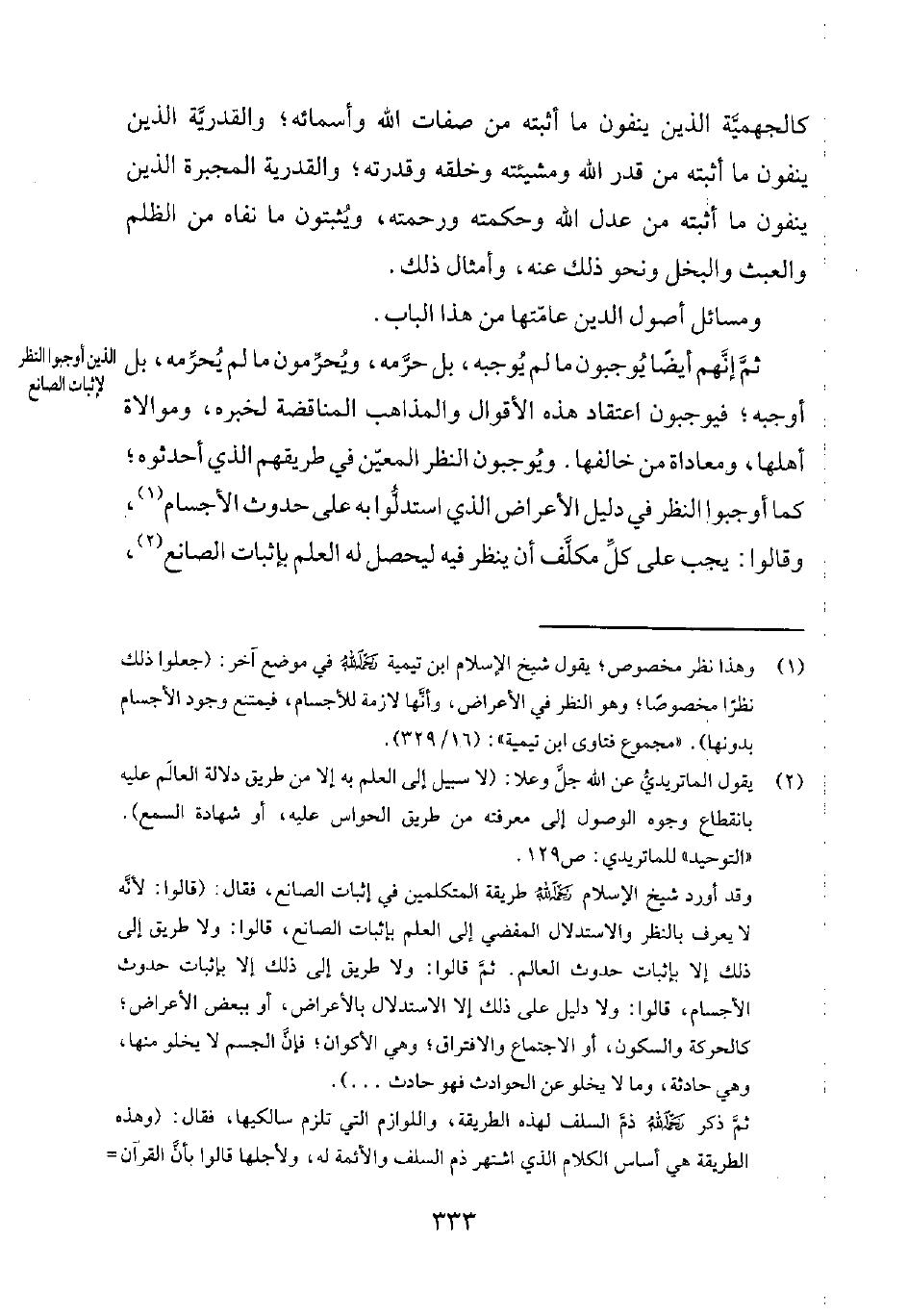 1 وهذا نظر مخصوص؛ يقول شيخ الإسلام ابن تيمية رحمه الله في موضع آخر: "جعلوا ذلك نظراً مخصوصاً؛ وهو النظر في الأعراض، وأنّها لازمة للأجسام، فيمتنع وجود الأجسام بدونها". مجموع فتاوى ابن تيمية 16329.