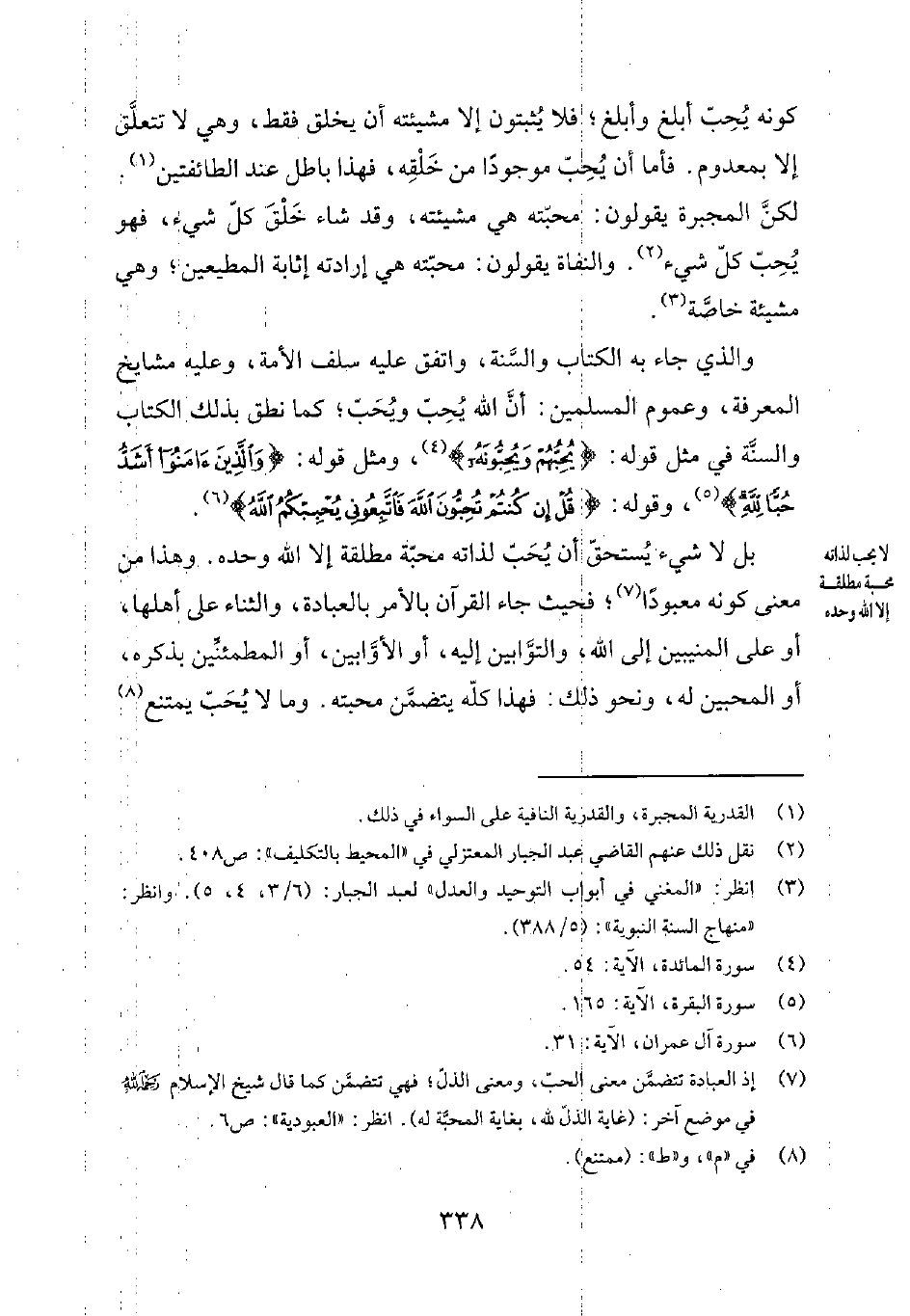 بل لا شيء يُستحقّ أن يُحَبّ لذاته محبّة مطلقة إلا الله وحده. وهذا من معنى كونه معبوداً7؛ فحيث جاء القرآن بالأمر بالعبادة، والثناء على أهلها، أو على المنيبين إلى الله، والتوّابين إليه، أو الأوّابين، أو المطمئنّين بذكره، أو المحبين له، ونحو ذلك: فهذا كلّه يتضمّن محبته. وما لا يُحَبّ يمتنع8
